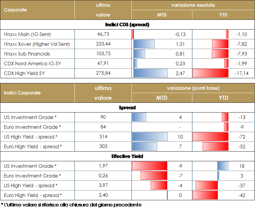 MERCATI DEI TITOLI CORPORATE Gli indici corporate non hanno espresso alcuna direzionalità specifica fino a giovedì, quando un movimento di risk off generalizzato ha causato un piccolo allargamento degli indici. Il timore di un peggioramento delle prospettive economiche dovuto principalmente alla diffusione della variante Delta e ad un ISM non manifatturiero inferiore alle previsioni, ha spinto lo spread HY ad un livello più elevato sia nella zona euro che negli USA (+5 bps e +9 bps rispettivamente). Lo spread espresso dall’indice IG in Eurozona ha chiuso la settimana invariato, mentre negli Stati Uniti si è allargato di 5 punti base. Tuttavia, dato il movimento di bull flattening nei titoli di Stato, gli indici hanno offerto un rendimento complessivo positivo durante la settimana. La scarsa propensione al rischio ha pesato soprattutto sui settori ciclici e sugli emittenti finanziari. I migliori performers sono stati gli emittenti considerati come bund-proxy: quelli con il rating più alto e situati nell’Europa centrale. I volumi delle nuove emissioni hanno già iniziato a risentire della stagionalità, e scenderanno ulteriormente quando le società entreranno nel loro periodo di blackout per gli utili del secondo trimestre. Durante la settimana hanno emesso Jab Holding (Baa2 500 mln senr 10y 1% – ben accolta dal mercato, ha stretto di 4 bps dopo l’emissione) e la banca italiana Banco BPM (BB 500 mln snr pref 5y 0,875% – ben accolta, non ha registrato alcun restringimento dopo l’emissione). A cura del team obbligazionario di Mediobanca SGR PERFORMANCE DEI TITOLI CORPORATE – Dati aggiornati alle 17.30 del 9 luglio 2021 VIEW STRATEGICA Corporate IG: Il supporto della politica monetaria con acquisti diretti e forward guidance su “tassi bassi a lungo” giustificano i livelli compressi degli spread. Nel corso dell’anno il miglioramento del ciclo economico garantirà ulteriore supporto alla solidità dei fondamentali. Manteniamo una view neutrale Corporate HY: Outlook positivo ma con possibili fasi di volatilità che potranno rappresentare occasioni di acquisto. Default rate contenuti con picco nel T1, su livelli comunque ridotti rispetto ai cicli precedenti. Supporto al mercato da fattori tecnici positivi e ricerca di rendimento. Manteniamo una view neutrale. |