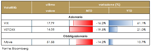A seguito dell’esito elettorale, gli indici di volatilità VIX e VSTOXX hanno registrato la riduzione nel rischio percepito dagli operatori, con una normalizzazione dei livelli sotto quota 17, dopo la brusca salita a seguito del risk-off di ottobre.