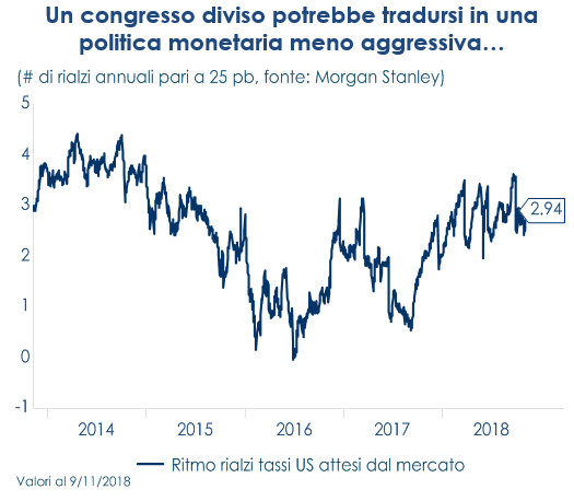 In linea con le attese, alle elezioni di metà mandato i democratici hanno conquistato la maggioranza alla Camera dei rappresentanti. I repubblicani hanno però rafforzato la maggioranza al Senato, dove la geografia elettorale era a loro più favorevole. Le elezioni prevedevano il rinnovo di un terzo del Senato e dell’intera Camera, l’elezione di governatori in molti stati oltre a quella di altre cariche locali. I Democratici, che ora potranno condurre l’opposizione a Trump grazie a una rinnovata posizione di forza, in campagna elettorale hanno promesso di agire su tre punti: controlli sui prezzi dei farmaci, programma infrastrutturale e riforma finanziaria della campagna elettorale. I democratici potranno soprattutto ostacolare la promessa fatta dal Presidente di un nuovo e ambizioso stimolo fiscale: la maggioranza democratica in un ramo del parlamento rende improbabile l’approvazione di un ulteriore pacchetto di stimolo fiscale nella seconda parte del mandato di Trump e, quindi, più probabile una graduale decelerazione della crescita economica US nella seconda metà del 2019, all’esaurirsi dello stimolo della riforma fiscale approvata dal Congresso nel 2017. Contestualmente, diminuisce il rischio di surriscaldamento dell’economia: un ulteriore stimolo fiscale avrebbe creato non solo più crescita ma anche più inflazione, costringendo la Fed ad essere più aggressiva. Quindi, un congresso diviso potrebbe tradursi anche in una politica monetaria meno aggressiva: il terminal ratedovrebbe attestarsi sopra il 3%, come implicato dai futures, e sotto il 3.5% segnalato dalla Federal Reserve stessa. Diviene, inoltre, improbabile l’approvazione di un programma infrastrutturale importante: benché sia il Presidente Trump sia i Democratici del Congresso hanno sostenuto in campagna elettorale la necessità di programmi infrastrutturali, i dettagli delle rispettive proposte sono sostanzialmente diversi e, cosa più importante, i Democratici non saranno motivati a raggiungere un accordo con la Casa Bianca prima delle elezioni presidenziali del 2020. L’assenza di un rinnovato stimolo fiscale e di un piano infrastrutturale si traduce in un minor stimolo alla crescita economica del paese. Viceversa, l’esito elettorale non dovrebbe influenzare l’evoluzione della contrapposizione commerciale con la Cina e l’imposizione di dazi elevati su molte importazioni da quel paese. Infatti, da un lato il Presidente ha la facoltà di deliberare in materia di dazi e imposte doganali volte a sfavorire l’importazione negli Stati Uniti di merci più competitive e meno costose, appellandosi alle norme di sicurezza nazionale, aggirando così l’approvazione del Congresso, dall’altro vi è un consenso diffuso anche tra i democratici riguardo la necessità di moderare i rischi derivanti dalle politiche economiche cinesi. La Cina, come nuovo gigante economico che insidia il primato americano, è percepita da molti americani in modo piuttosto negativo perché ritenuta sleale nel modo di fare concorrenza, nel sottrarre nuove tecnologie agli USA, e appare come il nuovo nemico. Pertanto le tensioni commerciali continueranno fino a quando l’impatto economico e/o di mercato non sia marcato e tale da indurre l’amministrazione ad un atteggiamento più costruttivo nei negoziati con la Cina. Tuttavia, una camera a maggioranza democratica potrebbe ritardare per l’approvazione della legislazione di attuazione dell’accordo USA-Messico-Canada.