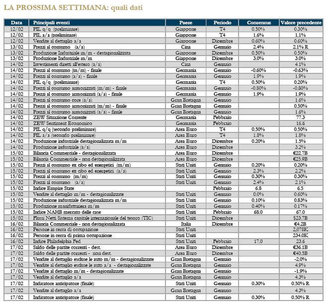 Settimana povera di dati negli Stati Uniti. Il dato di maggior rilievo è stato quello relativo alle scorte all’ingrosso, il cui rialzo a dicembre è stato pari al +1.0% m/m, invariate rispetto alle stime preliminari. Il rapporto scorte-per-vendita per il settore all’ingrosso è sceso a 1.29 nel mese di dicembre, segnando un minimo di due anni. Positivi anche i dati sul mercato del lavoro. Le richieste settimanali di sussidi di disoccupazione relativi alla settimana conclusa il 4 febbraio sono tornati a ridursi e sono risultati inferiori alle attese: le nuove richieste di sussidi si sono rivelate al di sotto delle attese e stabili a 234mila unità, mentre quelle continue sono leggermente superiori a 2.078 milioni.
