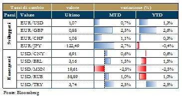 Guidato dall’aumento dei prezzi dei metalli industriali, l’indice PPI cinese è salito del 7.8% a/a al disopra del valore riportato in gennaio (6.9%) e delle previsioni, sollevando ulteriormente le prospettive per una reflazione globale nei prossimi mesi. Segnali temporanei di raffreddamento sono invece giunti dal fronte dei prezzi al consumo: in febbraio l’indice CPI ha registrato una crescita solo dello 0.8% a/a, rispetto al +2.5% del mese precedente e alle attese degli analisti (+1.7%) per un rallentamento meno marcato. Il dato si conferma ben al di sotto del target del governo del 3%. Il rallentamento dovrebbe probabilmente essere temporaneo ed imputabile alla discesa dei prezzi degli alimentari che segue le celebrazioni del Capodanno cinese. In Giappone, la dinamica salariale continua ad essere silente, trend in atto da ottobre 2016. Infatti in gennaio i salari reali sono rimasti invariati, riportando una variazione nulla su base annua, dato che l’aumento nominale dello 0.5% è stato compensato dall’equivalente aumento dell’indice dei prezzi.