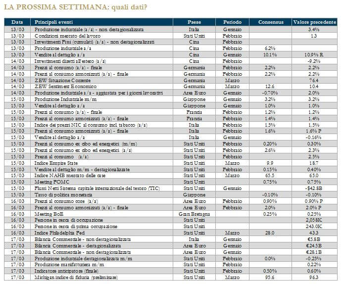 Europa: Focus sul settore finanziario e assicurativo, con Intesa Sanpaolo che ha firmato l’accordo per la cessione dell’intera quota in Allfunds Bank ai fondi Hellman&Friedman e al fondo sovrano di Singapore GIC per circa €900mln in contanti; dall’operazione si stima una plusvalenza netta di €800mln. Ubi ha lanciato e prezzato una nuova obbligazione subordinata di tipo Tier2 a 10 anni e mezzo (call dopo cinque anni e mezzo), il cui importo è stato fissato a €500mln. Per quanto riguarda MPS, alcuni giornali hanno parlato di vendita in un unico blocco degli Npl a meno del 25% del loro valore contabile lordo con un mese di tempo per presentare le offerte vincolanti. Intanto la banca ha rivisto alcune voci del bilancio 2016 rispetto ai risultati preliminari dopo avere dato il via libera alla proposta preliminare del piano di ristrutturazione inviata alle autorità competenti per avviare il confronto e arrivare alla sua approvazione. L’AD di Pop Vicenza e il presidente del comitato strategico di Veneto Banca hanno avuto un incontro al Tesoro per parlare di una possibile ricapitalizzazione precauzionale dei due istituti, secondo una fonte a conoscenza diretta del dossier. Fondazione CariVerona non sta valutando l’ipotesi di acquisto della quota del 15.1% circa di Cattolica assicurazioni detenuta da Popolare Vicenza. Amissima Holdings, che fa capo a investitori affiliati ad Apollo Global Management e ad altri, respinge le accuse contenute nella relazione predisposta da banca Carige in vista dell’assemblea del 28 marzo e si riserva “ogni rimedio di legge”. Amissima ha già anticipato una richiesta di indennizzo per un ammontare indicato in via preliminare in oltre €200mln. Riguardo Poste Italiane, il governo sta valutando eventuali evoluzioni dell’azionariato, ha detto l’AD Caio dopo che una serie di esponenti Pd ha espresso dubbi sulla privatizzazione della seconda tranche dell’azienda. Anima Holding ha realizzato utili e ricavi più bassi nel 2016 rispetto al precedente esercizio per effetto dei maggiori oneri (€9mln) legati all’accordo con l’agenzia delle Entrate e a commissioni di incentivo più che dimezzate; la società ha comunicato di aver chiuso il mese di febbraio con una raccolta netta di circa €170mln. In ambito estero, il CdA di Deutsche Bank ha deliberato una maxi ricapitalizzazione da €8mld, insieme a un piano tagli da €2mld entro il 2018, il reintegro di Postbank, la cessione di una quota della divisione Asset Management e l’intenzione di proporre un dividendo compreso tra €0.11 e €0.19 per azione nel 2017. Nel settore auto, FCA punta ancora a una fusione con il gruppo General Motors, ma considera Volkswagen una buona alternativa. Sia Gm che Volkswagen hanno ribadito di non avere interesse a un’operazione con Fca. IlSole24Ore scrive che Marchionne resterà in Ferrari fino al 2021, dopo la data prevista per la sua uscita da Fiat Chrysler.