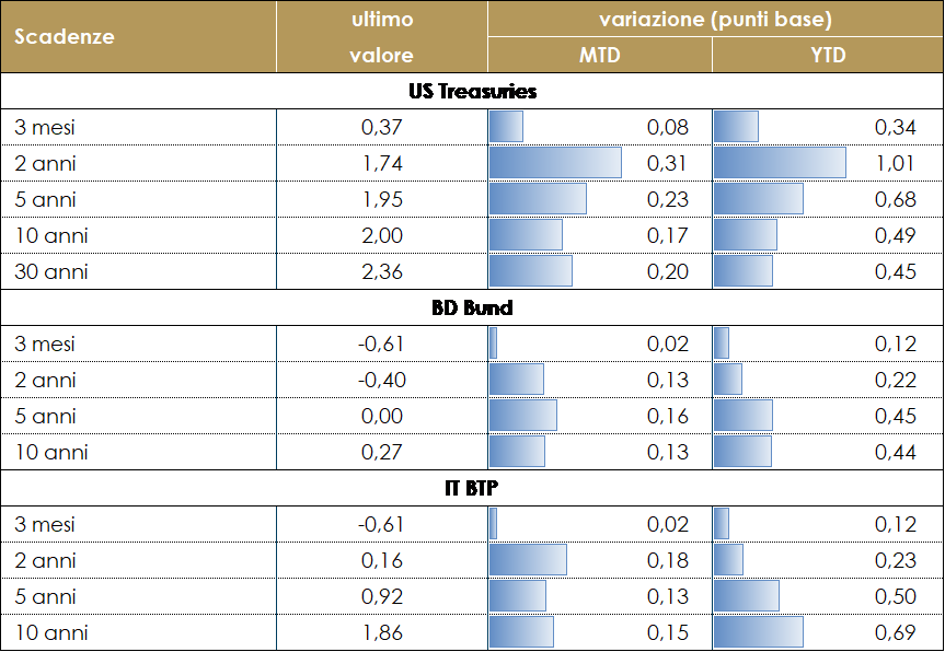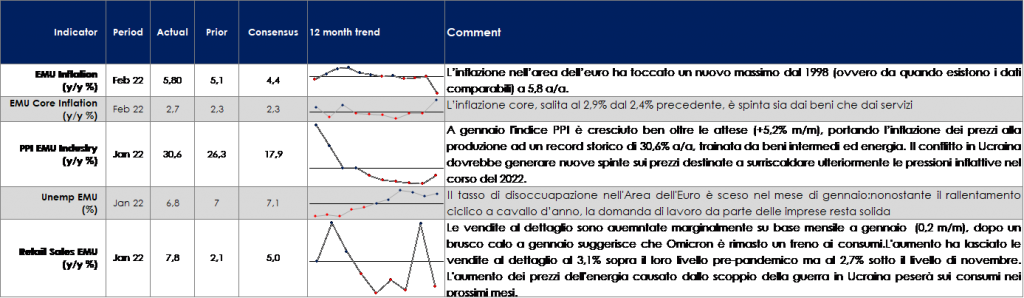 | MERCATI DEI TITOLI GOVERNATIVIIncertezza sulla situazione geopolitica e conseguenze sulla possibile rimodulazione della politica monetaria da parte di FED e BCE sono stati i temi che hanno guidato la volatilità dei rendimenti obbligazionari dei principali paesi sviluppati. I rendimenti obbligazionari statunitensi hanno registrato un moderato aumento durante la settimana sostenuti sia dall’aumento delle aspettative di inflazione sia dalla componente reale. Il decennale ha completamente ritracciato il rally innescato dall’invasione russa dell’Ucraina e si è stabilizzato leggermente sotto il 2%. La settimana prossima l’attenzione sarà rivolta alla riunione di politica monetaria della FED che dovrebbe consegnare il primo rialzo del costo del denaro, l’attenzione sarà rivolta al passo del processo di normalizzazione della politica monetaria e al tono della conferenza stampa. Lo scenario attuale per la Fed è infatti senza precedenti: dopo la pandemia, una guerra a fronte di inflazione alta e crescente e di un mercato del lavoro in salute, che potrebbe creare nuove spinte inflattive.