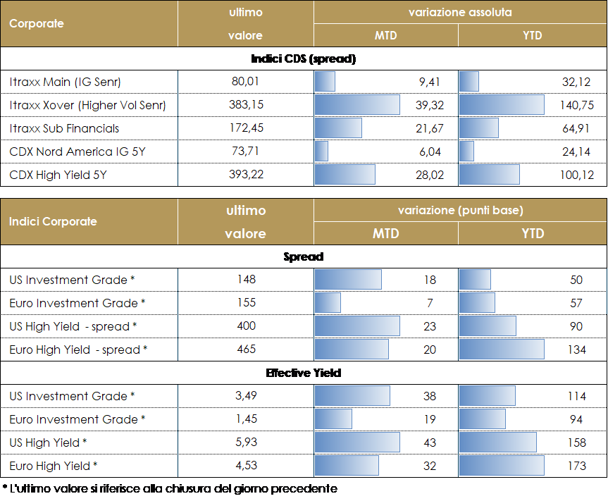 MERCATI DEI TITOLI CORPORATEI mercati del credito hanno vissuto una settimana tra le più intense e contrastate da diverso tempo, chiudendo al margine positivamente (in termini di spread performance) dopo una apertura molto debole nei primi due giorni che ha portato il mercato a testare nuovi livelli massimi in allargamento a fronte di notizie ancora preoccupanti sul conflitto tra Russia e Ucraina e lo spike dei prezzi delle commodity sulle nuove sanzioni in particolare da US e UK. Nella giornata di mercoledì il trend ha avuto una sostanziale pausa con marcato ritracciamento di tutte le asset class rischiose che ha permesso di recuperare i livelli di inizio settimana sul credito.