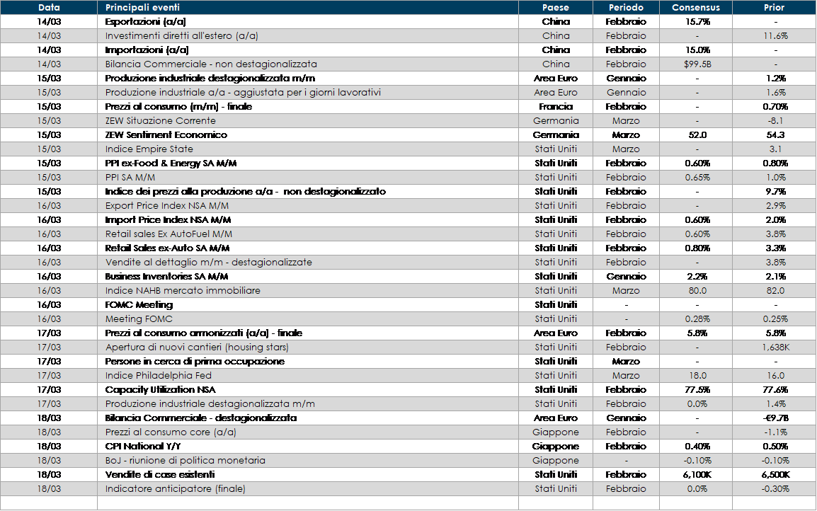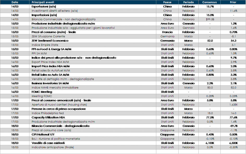 - Stati Uniti: l’attenzione sarà rivolata alla riunione di politica monetaria della FED, che dovrebbe consegnare il primo rialzo del costo del denaro. Inoltre, verranno pubblicati anche i dati sulle case attualmente in vendita, sui nuovi cantieri edili e sui permessi edili rilasciati. Riguardo al mercato del lavoro ci sarà l’aggiornamento delle richieste iniziali e continue di sussidi di disoccupazione. Completano il quadro il dato sulle vendite al dettaglio, la produzione industriale, l’indice dei prezzi alla produzione e alcuni indici di fiducia sull’economia sia dal settore manifatturiero sia dai consumatori.