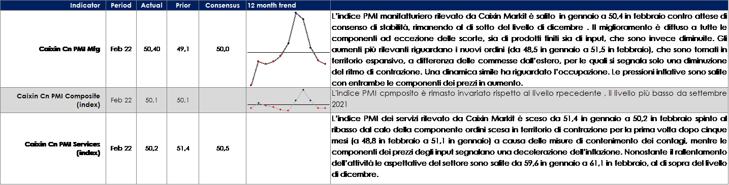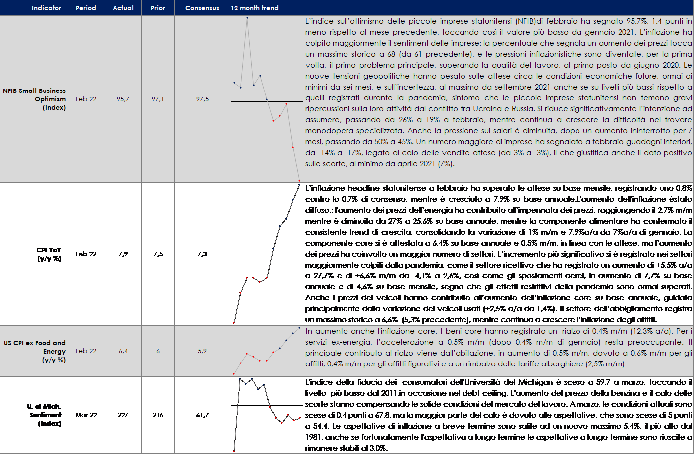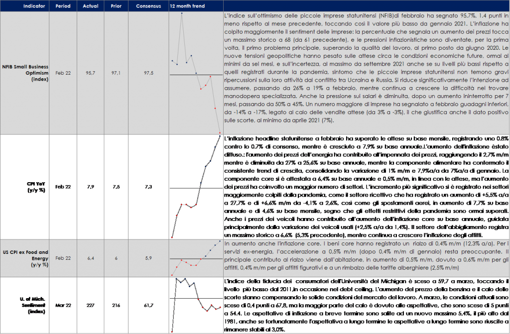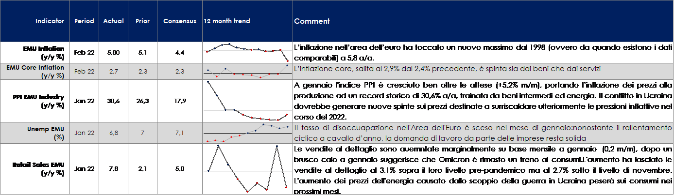 Anche la Banca d’Inghilterra la settimana prossima dovrebbe continuare il suo ciclo di rialzo del costo del denaro, dato che le sue preoccupazioni per il sentiero dell’inflazione hanno preceduto quelle sia della Fed sia della BCE. Nell’Area Euro, questa settimana i mercati sono stati guidati dalla riunione di politica monetaria della BCE e dalla meno prudente accelerazione nella via di uscita dalle misure monetarie ultra-espansive, con uno scenario di crescita rivisto al ribasso. I minori acquisti attesi per quest’anno all’interno del programma APP pesano particolarmente sui paesi a debito più elevato, come l’Italia. Il BTP decennale, dopo un aumento di circa 20pb in termini di rendimento, si stabilizza attorno a 1.9%. Sul segmento a breve termine della struttura a termine si è registrato un marcato aumento delle aspettative di inflazione, complice l’aumento del prezzo dell’energia e la revisione al rialzo delle proiezioni della BCE. VIEW STRATEGICA Governativo US: I trend di lungo termine proseguono su traiettorie al rialzo sostenibili, il ciclo economico (pur in rallentamento) è ancora favorevole e le condizioni finanziarie rimangono accomodanti. Nell’attuale contesto geopolitico l’area statunitense appare favorita alla luce di 3 fattori: l’indipendenza energetica la rende meno fragile ai rialzi dell’oil, il livello dell’interscambio commerciale con la Russia è modesto ed infine la composizione dell’indice azionario la rende più resiliente agli attuali rischi. Governativo EU: Continuiamo ad avere una view negativa sui rendimenti obbligazionari europei, aspettandoci una perdita di valore sia dalla componente carry che dalla componente prezzo |