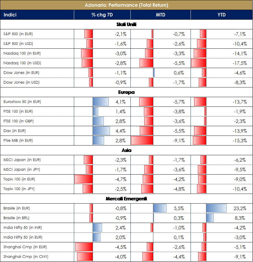 Rally del mercato nonostante la sorpresa hawkish Rimbalzo del mercato europeo questa settimana (e specialmente nella giornata di “short squeeze” di mercoledì 9 marzo) con il +3.88% dell’EuroStoxx (quasi +7% mercoledì) e +4.80% del FTSE MIB (che supera il DAX); di contro troviamo un S&P500 a -1.50% e Nasdaq Composite a -1.90%. I migliori settori della settimana sono risultati essere Insurance +8%, Travel&Leisure +7%, Retail, Basic e Industrials +6% contro il -0.30% del Food&Beverage and Tobacco e la performance flat delle Auto. Lo stile “value” ha sovraperformato il “growth” europeo del +1.80% nella settimana. Il rebound può essere attribuito principalmente all’eccessivo movimento al ribasso avvenuto la settimana scorsa (con un panic selling storico in termini di outflow sull’equity europeo e su certi settori in particolari) e ad un newsflow “meno negativo del previsto” e più stabile. Inoltre, il rally degli indici azionari può essere ricollegato anche a fattori tra cui il rallentamento dei prezzi delle commodity energetiche e alle aspettative di un ingente piano fiscale da parte dei leader della EU per prevenire una probabile recessione. Il de-grossing degli Hedge Funds di settimana scorsa resta comunque ancora pari alla metà di quello avuto durante lo short squeeze del 21 gennaio e inzio covid nel marzo 2020. Ad ogni modo, EuroStoxx a 13x PE resta un multiplo certamente attrattivo, complice una reporting season continuata positivamente (prossima alla conclusione), sebbene con una minor visibilità da parte delle società nel dare guidance (topline e margini) al 2022. “Beat”: Brunello Cucinelli, Leonardo, Rubis, Tod’s, Eurazeo, JCDecaux, National Express, SMCP, Biffa, Brenntag, Deutsche Post DHL, Elis, Quilter, Salvatore Ferragamo; “Miss”: Danieli, Datalogic, Haulotte Group, Hugo Boss, Jeronimo Martins, Maisons du Monde, Geberit, Legal & General. L’aumento dei costi delle materie prime e dell’inflazione in generale resta un elemento da monitorare in vista di una revisione delle stime sugli utili aziendali. In questa situazione di incertezza e alta volatilità (seppur rientrata considerando il VIX a 30 da 37 e VStoxx a 40 da 60) è stata la volta dei dati macro e delle Banche Centrali: la riunione della BCE si è complessivamente risolta con un tentativo di mettere insieme le istanze dei falchi e delle colombe con un risultato che risulta essere mediamente più hawkish con un tapering accelerato e possibilità di fine del QE nel 3Q22.; La Lagarde ha sottolineato come la guerra pone rischi concreti sulla crescita (GDP rivisto al ribasso per il 2022 da +4.2% a +3.7%) e rischi al rialzo sull’inflazione (5.1% exp vs +3.2% precedente). Nel frattempo, il dato CPI MoM si è attestato a +0.8% (vs +0.6% precedente) e quello annuale CPI YoY a +7.9% (+6.4% ex Energy & Food), nonché al massimo da 40 anni. Sul fronte geopolitico sembrano falliti i colloqui tra Russia e Ucraina; la metà della popolazione di Kiev è scappata dalla capitale e si stima che circa 100bnUSD di assets e infrastrutture sono stati distrutti. Dal meeting di Versailles è emerso che per il momento non c’è un accordo sulle emissioni comuni e che il percorso sembra ancora molto lungo; sì invece agli aiuti di stato nei confronti delle imprese colpite dalla guerra. A cura del team Core Equity Value di MB SGR VIEW STRATEGICA La view sul comparto azionario continua ad essere costruttiva per un trimestre che, pur con una certa volatilità, presenta una buona crescita degli utili e una stagionalità attraente per le attività finanziarie rischiose. Tra i rischi a questo scenario un certo grado di rallentamento macroeconomico, la normalizzazione della politica monetaria (che potrebbe risentire di un tasso di inflazione più alto più a lungo) e i timori sul mercato immobiliare cinese. Azionario USA: I trend di lungo termine proseguono su traiettorie al rialzo sostenibili, il ciclo economico (pur in rallentamento) è ancora favorevole e le condizioni finanziarie rimangono accomodanti. Nell’attuale contesto geopolitico l’area statunitense appare favorita alla luce di 3 fattori: l’indipendenza energetica la rende meno fragile ai rialzi dell’oil, il livello dell’interscambio commerciale con la Russia è modesto ed infine la composizione dell’indice azionario la rende più resiliente agli attuali rischi. Azionario Europe: L’attuale situazione geopolitica e la dipendenza energetica dell’EMU suggeriscono di portare a neutrale l’esposizione sul settore. L’incertezza geopolitica resta, tuttavia, bilanciata da politiche fiscali espansive, marcato accomodamento monetario e dalla debolezza dell’EURO. Elementi di rischio da monitorare sono legati a un possibile inasprimento delle operazioni militari e alle conseguenti contromisure economiche. |