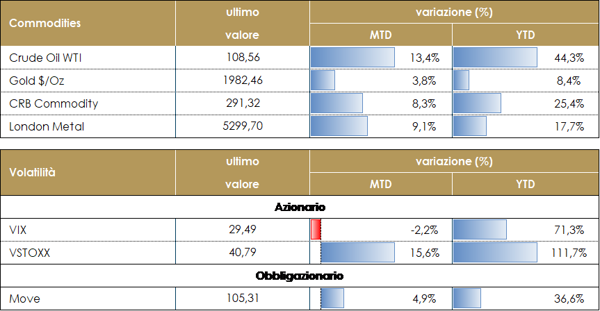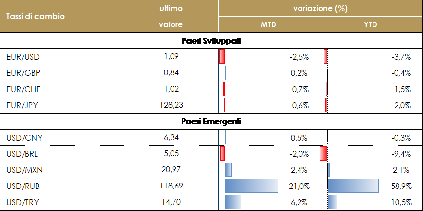 Il prezzo del petrolio resta sopra i 100 dollari al barile e registra una settimana particolarmente volatile seguendo l’avvicendarsi delle notizie geopolitiche. In particolare, WTI e Brent hanno toccato nuovi massimi a 130 dollari nella giornata di martedì a seguito dell’annuncio del blocco al petrolio russo da parte di USA e Gran Bretagna. Gli USA hanno deciso di bloccare le importazioni dalla Russia di petrolio, alcuni altri prodotti petroliferi, LNG e carbone. Le imprese hanno 45 giorni per terminare i contratti per la fornitura di energia in essere, mentre vengono proibiti investimenti nel settore energetico russo e i finanziamenti a società estere che investono nel settore. Il Regno Unito si è associato agli USA, annunciando un blocco delle importazioni di petrolio russo (che rappresentano circa l’8% del totale) da attuare entro fine anno. In settimana, inoltre, l’Unione Europea ha elaborato un piano, denominato REPowerEU, per ridurre la dipendenza dal gas russo di circa l’80% entro la fine del 2022. Circa metà della sostituzione verrebbe da maggiori acquisti di LNG; altri contributi rilevanti dall’accelerazione sulle rinnovabili (solare ed eolico), dal risparmio energetico in ambito civile e da maggiori flussi via gasdotto da altri fornitori. Nel rapporto, la Commissione sottolinea che gli Stati membri potrebbero raccogliere fino a €200 mld tassando gli extra-profitti delle società elettriche, risorse che possono essere usate per mitigare l’impatto su industria e consumatori. Il documento preannuncia interventi normativi per imporre il riempimento degli stoccaggi di gas al 90% entro l’1/10, con una “equa allocazione” dei costi. Aumentano anche i costi di trasporto secondo il Wall Street Journal, le tariffe di trasporto del greggio via mare sono triplicate nelle ultime due settimane (cioè da quando è iniziata la guerra in Ucraina): il costo giornaliero di una petroliera di medie dimensioni, navi usate soprattutto nel Mar Nero e nel Mar Baltico, è cresciuto da 10 mila a 30 mila dollari. TASSI DI CAMBIO La situazione in Ucraina è ovviamente rimasta al centro dell’attenzione del mercato FX, almeno fino a giovedì, quando la conferenza stampa della BCE ha causato un forte repricing nel mercato dei tassi e, di conseguenza, un movimento anche in tutti i cross EUR. Alla fine della settimana l’euro si è apprezzato contro tutte le valute del G10, tranne la corona svedese che è rimasta supportata dall’atteggiamento meno accomodante della Riksbanken. Lo yen giapponese e il franco svizzero hanno sofferto contro il dollaro, poiché le rispettive banche centrali hanno mantenuto un atteggiamento accomodante rispetto a quello delle altre banche centrali, in particolare se paragonate a FED e BCE. Nei mercati emergenti, le valute dell’Europa centrale sono rimbalzate contro il dollaro, riducendo le perdite subite dall’inizio della guerra in Ucraina. Lo zloty polacco si è apprezzato di oltre il 2,5% rispetto al dollaro, mentre la corona ceca e il fiorino ungherese sono saliti rispettivamente del 2,3% e dell’1,9%. Tuttavia, il rimbalzo sembra legato a un aggiustamento del posizionamento degli investitori piuttosto che all’inizio di un nuovo trend. A cura del team obbligazionario di Mediobanca SGR |