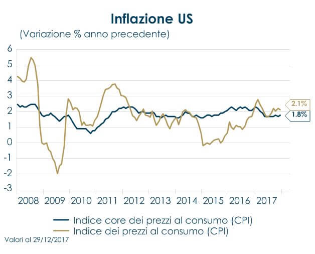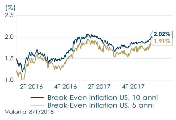 | A inizio gennaio la pubblicazione dei verbali della riunione di dicembre 2017 del FOMC ha riportato l’attenzione sull’futuro percorso dell’inflazione. Il FOMC, da un lato, ha ribadito l’ottimismo riguardo alla solidità del ciclo economico e lo stato di salute del mercato del lavoro statunitense, dall’altro ha espresso dubbi sullo scenario d’inflazione: la maggioranza del consiglio ritiene che i fattori di freno transitori stiano scomparendo, ma “alcuni” membri temono che l’inflazione possa mantenersi anche quest’anno lontana dal 2%, a causa di fattori strutturali. In settimana sono state rilasciate le stime dell’inflazione alla produzione e al consumo di dicembre. La stima dell’indice CPI di dicembre ha confermato una crescita stabile per le voci core, al netto di alimentari ed energia a 1,7% a/a e una modesta correzione da 2,2% a 2,1% a/a. Se l’inflazione stenta ancora a manifestarsi nelle statistiche ufficiali, i mercati sono tornati ora a prezzare un’inflazione futura più elevata, sulla scia dell’aumento marcato dei prezzi delle materie prime – tra cui prezzo del rame e del petrolio, con il Brent che ha toccato il nuovo massimo dal maggio 2015 sopra quota 68 dollari al barile – e iniziando a scontare l’effetto espansivo implicito nel maggior stimolo fiscale. Negli ultimi mesi abbiamo assistito ad un aumento delle break-even inflation -che riflettono il premio di rendimento dei titoli governativi nominali sui corrispondenti Inflation Linked – nei principali paesi sviluppati. Negli Stati Uniti a partire del mese di dicembre le break-even inflation hanno subito un’accelerazione tornando ai valori raggiunti nel 2016 dopo l’elezione di Trump. Riteniamo che alla base del recente movimento delle break-even inflation negli Stati Uniti non vi sia solo l’aumento del prezzo del petrolio. In teoria la variazione del prezzo del greggiodovrebbe avere un effetto positivo esclusivamente sul segmento a breve termine della curva delle break-even inflation, e impattare solo marginalmente il segmento a lungo termine della stessa, causandone un appiattimento. Questo è avvenuto nell’Area Euro, dove le break-even inflation a breve termine sono salite più di quelle a lungo temine, mostrando che i mercati stanno seguendo quanto dichiarato dalla BCE, secondo cui l’inflazione core nell’Area Euro non segna ancora segnali convincenti di ripresa. Invece negli Stati Uniti è aumentato anche il segmento a lungo termine della curva delle break-even inflation. Questo ci lascia pensare che altri fattori, oltre al rialzo del prezzo del petrolio, abbiano contribuito a rafforzare il movimento al rialzo delle break-even inflation, quali l’approvazione della riforma fiscale negli Stati Uniti e una sorpresa positiva sui dati macroeconomici rilasciati nelle ultime settimane. In questo contesto, riteniamo che l’inflazione resterà moderata ma che aumenterà il rischio di una sua crescita repentina e di un re-pricing del rischio di inflazione. Suggeriamo, per tanto, l’utilizzo di strumenti finanziari che consentono la copertura del rischio di inflazione. Negli Stati Uniti il rischio di una fiammata inflattiva è più elevato rispetto al 2017 in quanto il mercato del lavoro si è ulteriormente mosso verso il pieno impiego e l’aumento dell’occupazione dovrebbe esercitare qualche pressione ciclica sui salari. Inoltre, dovrebbe esaurirsi la pressione al ribasso derivante da alcuni fattori non ciclici (in particolare nel settore delle comunicazioni e dei farmaceutici), che hanno pesato sull’inflazione US nel 2017. | Le aspettative di inflazione negli Stati Uniti sono tornate a crescere iniziando a scontare l’effetto espansivo implicito nel maggior stimolo fiscale