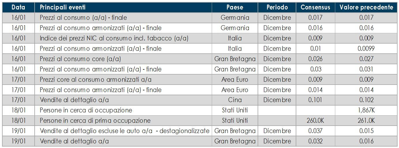 - Stati Uniti: Scarsi i dati di interesse in arrivo la prossima settimana anche dagli Stati Uniti. L’attenzione degli investitori si concentrerà su produzione industriale e qualche dato sul mercato immobiliare, tra cui nuove costruzioni abitative e permessi edilizi di dicembre.