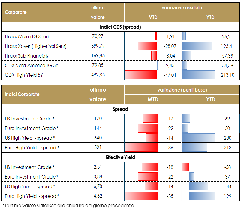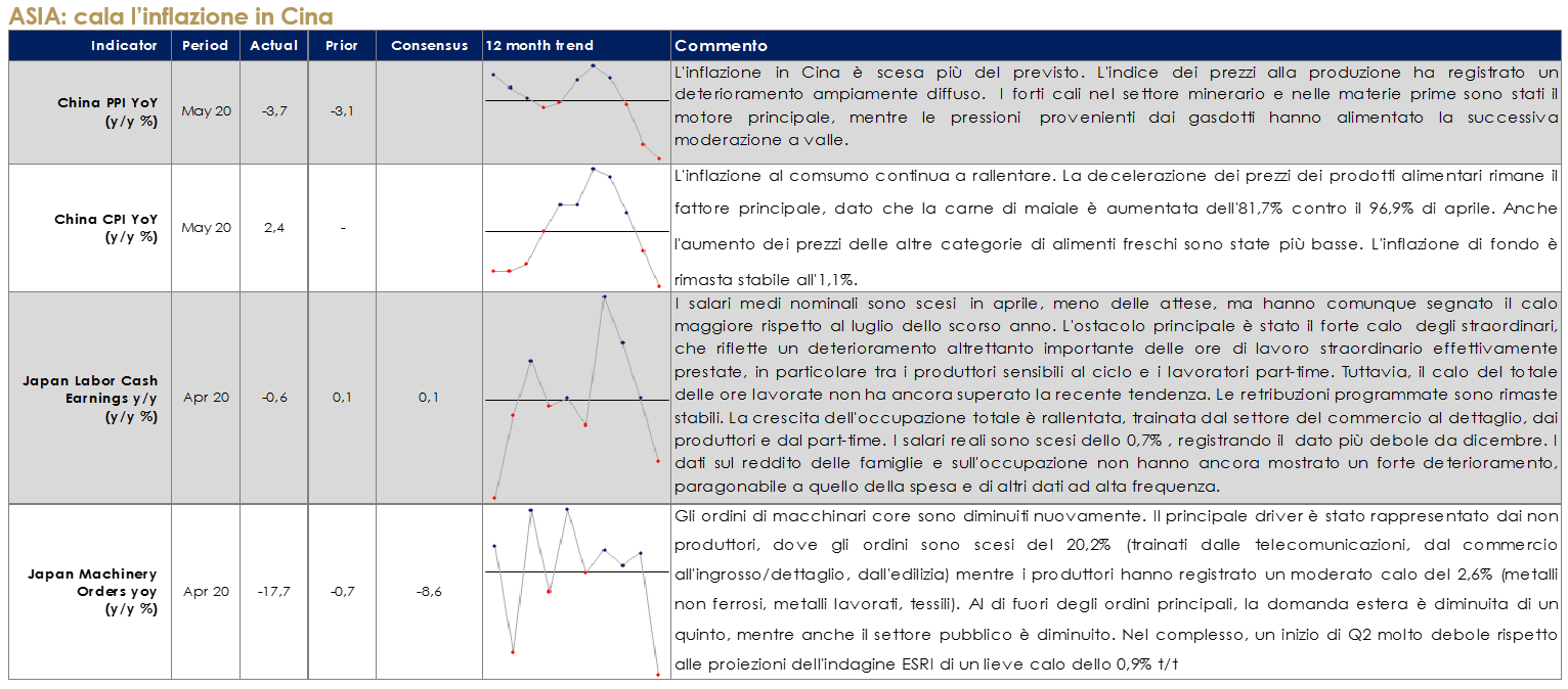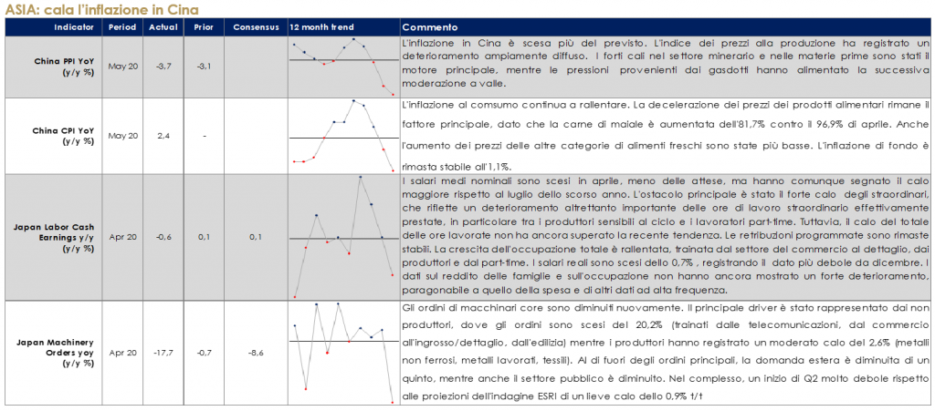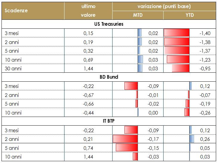 Settimana influenzata dal clima generale di risk off che ha portato a un ribasso dei rendimenti su tutte le curve governative. I toni cauti di Powell (che hanno spostato l’attenzione sull’outlook macro molto debole e sulla ripresa che pare ancora abbastanza lontana), unito a un incremento dei casi di coronavirus in alcuni stati americani con timori per una seconda ondata di contagi, hanno alimentato il rally sul mercato dei tassi. In US, il treasury a 10Y è sceso in area 0.70% di rendimento con sovraperformance della parte lunga della curva, confermando che la propensione al rischio, alle attuali condizioni, ha probabilmente raggiunto il suo limite. Il rally di questa settimana ha completamente assorbito il sell-off visto nella prima settimana di giugno e i rendimenti dei governativi sono rientrati nel trading range di aprile-maggio. Il mercato è tornato a concentrarsi su una prospettiva di crescita economica asfittica: la Fed non sembra aspettarsi una ripresa a V e, di conseguenza, i tassi di politica monetaria rimarranno ancorati a zero con continui acquisti di Treasury e MBS al ritmo attuale.La debolezza del sentimenti si è estesa anche in Area euro. Il rendimento del Bund 10Y è sceso verso -0,40%, con la curva tedesca in flattening (lo spread 2/10Y si è appiattito di 5 pb). Il clima di risk off non si è tradotto in debolezza dei tassi periferici: le condizioni reali (mercati risk-off + nuove emissioni BTP) non sembravano sicuramente supportive per gli spread, ciononostante l’allargamento è stato molto contenuto (la carta semi-core ha addirittura stretto contro la Germania). L’asta del Tesoro italiano è stata ben accolta con una buona domanda soprattutto del nuovo titolo a 3y, confermando il buon supporto delle banche in vista delle prossime operazioni di Tltro della BCE.