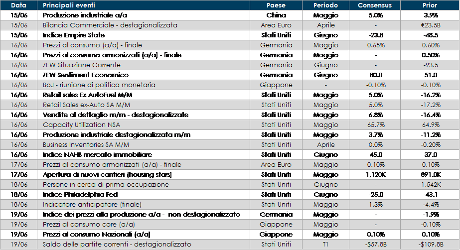 • Stati Uniti: saranno pubblicati i dati sulle vendite al dettaglio e la produzione industriale del mese di maggio, oltre che nuove indicazioni sull’andamento del mercato immobiliare.