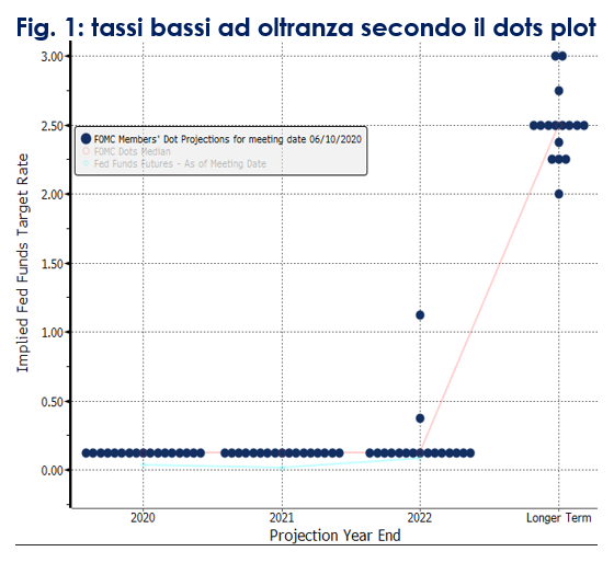 La Fed ha pubblicato per la prima volta da sei mesi le proiezioni macroeconomiche (il Summary of Economic Projections-SEP) e il diagramma delle previsioni dei governatori sull’andamento dei Fed Funds rates, i cosidetti dots. Quest’ultimi hanno mostrato che la Fed si aspetta tempi lunghi per la ripresa economica e conseguentemente di mantenere i tassi a zero fino alla fine dell’orizzonte di previsione. Allo stesso tempo il presidente J. Powell ha ribadito che la Fed “non sta nemmeno pensando di aumentare i tassi in questo momento”. L’elemento più singolare è stata la mancanza di dissenso intorno a questa visione. Nessun membro del FOMC ha previsto aumenti dei tassi quest’anno o il prossimo, e solo due membri si aspettano un aumento nel 2022. Questo forte consenso suggerirebbe che l’opinione all’interno della Fed è che i tassi debbano rimanere a zero ben oltre il 2022. I futuri commenti dei membri della FOMC a tal riguardo offriranno indicazioni a riguardo. Questo dovrebbe appiattire ulteriormente la traiettoria prevista per il fed fund rate.