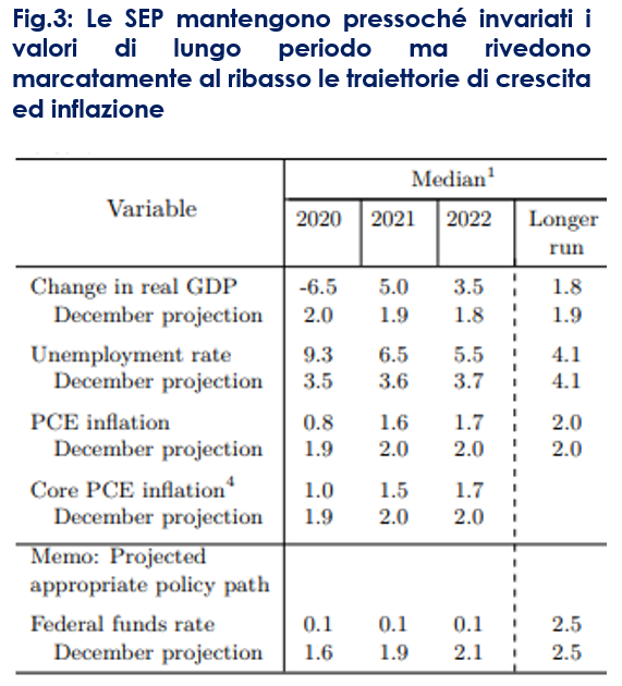 Fig.3: Le SEP mantengono pressoché invariati i valori di lungo periodo ma rivedono marcatamente al ribasso le traiettorie di crescita ed inflazione