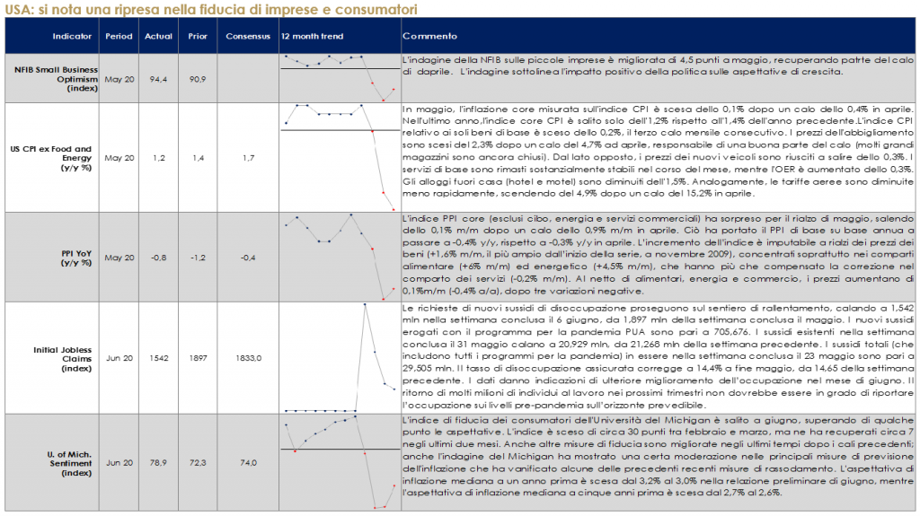 • Europa: nell’Area Euro sarà pubblicato il dato relativo alla bilancia dei pagamenti per il mese di aprile n. La BCE annuncerà i risultati della sua ultima TLTROIII. Inoltre, il Consiglio Europeo dominerà i negoziati sui progressi sul Recovery Fund. In Germania sarà pubblicato l’indice ZEW per il mese di maggio.