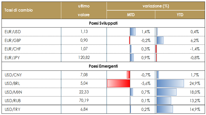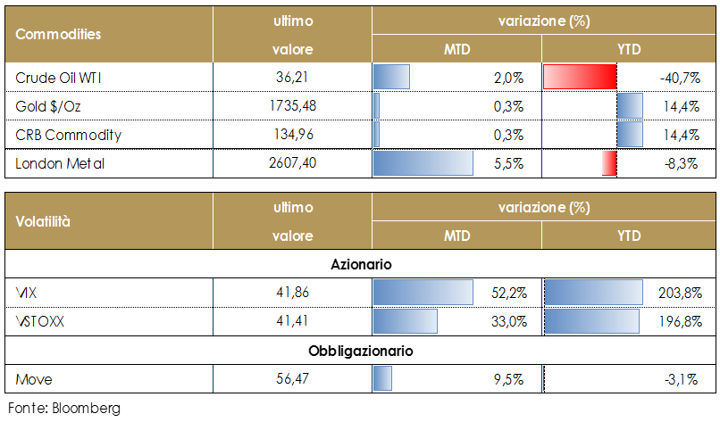 I mercati sono diventati moderatamente più bullish sulle attese di riapertura dopo i lock-down dovuti alla Covid-19. Il forte miglioramento del sentimento di rischio è il principale motore della recente debolezza del dollaro USA. Questa settimana la Fed ha chiarito che rimane impegnata a mantenere tassi prossimi allo zero anche dopo l’inizio della ripresa e che l’attenzione si concentra sull’inflazione che dovrebbe restare ostinatamente bassa. La Fed ha cosi riacceso un significativo aumento della risk aversion innescando anche un ampio recupero del dollaro. Conseguentemente l’euro ha corretto sul generalizzato recupero del dollaro, mentre lo yen si è rafforzato. Debole la sterlina che risente dell’incertezza sui negoziati con l’UE, che rimane il principale fattore di rischio per la valuta britannica, a meno che il Regno Unito non chieda un’estensione del periodo di transizione, ipotesi al momento non avvalorata da segnali di apertura in tal senso.