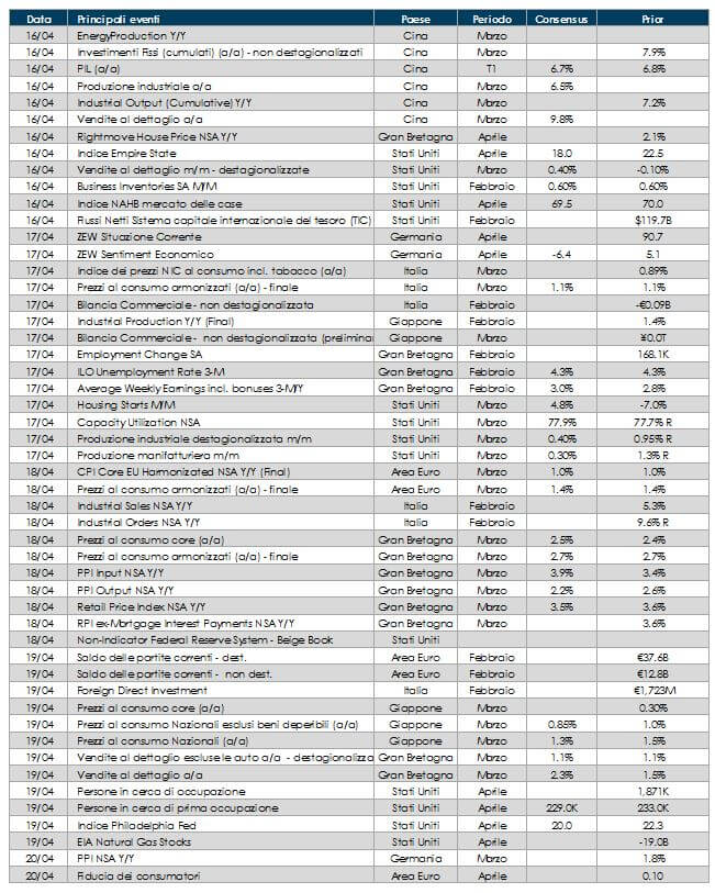 - Stati Uniti: disponibili i dati sul mercato immobiliare di marzo, tra cui nuove costruzioni abitative e permessi edilizi. Inoltre saranno pubblicate le vendite al dettaglio, che dovrebbero riaccelerare dopo tre mesi di debolezza, e la produzione industriale che dovrebbe risultare in moderato aumento.