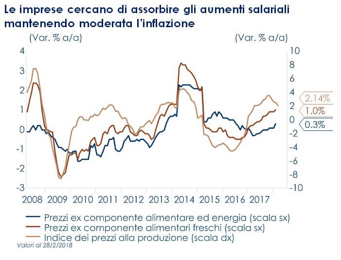 - Le aspettative di inflazione continua a restare particolarmente moderate, anche perché le imprese cercano di assorbire l’aumento dei salari attraverso una riduzione dei servizi