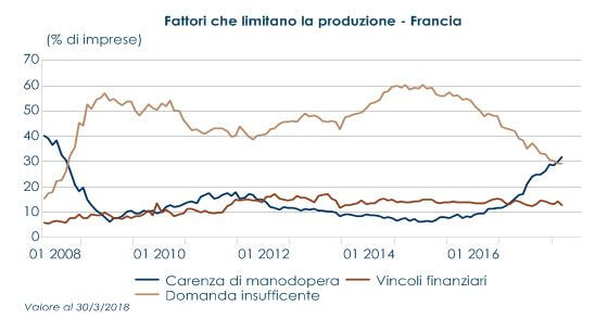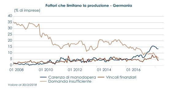I dati relative al commercio tedesco segnalano un contesto più debole nel mese di febbraio, lasciando intravedere una moderata perdita di momentum della crescita tedesca. L’avanzo commerciale è sceso a € 19,2 miliardi rispetto ai precedenti € 21,5, dopo che le esportazioni sono diminuite del 3,2% m/m e che le importazioni sono diminuite dell’1,2%. Il calo delle esportazioni è in linea con il recente calo degli ordinativi, anche se hanno pesato i condizionamenti negativi e le difficoltà di approvvigionamento. Anche la produzione industriale dell’Area Euro ha mostrato un rallentamento in febbraio, (-0,8% m/m; consenso: 0,2% m/m). La produzione continua a crescere su base annua, ma il tasso di crescita scende a 2,9% a/a (consenso: 3,8% a/a). Il dato conferma dunque un inizio anno sottotono per l’attività produttiva delle imprese dell’Area Euro, dopo un 2017 che ha comunque visto il tasso di crescita dell’economia aggregata ai massimi da 10 anni.Questo rallentamento sembra essere stato guidato da tre fattori, quali le condizioni meteorologiche avverse, la forza dell’euro e vincoli di capacità produttiva. Infatti, la survey della Commissione Europea, che indaga quali siano i fattori che stanno frenando la produzione, ha rilevato che in T1, la proporzione di imprese industriali che hanno riferito di avere livelli inadeguati di capex è ai massimi dal T2 2011, mentre la proporzione di imprese industriali e servizi, che denunciavano la mancanza di personale per la loro attività, è stata la più alta dal sondaggio del 2003. Al contrario, la proporzione di imprese che lamentato la mancanza di domanda era è stata la più basso da prima della crisi finanziaria.