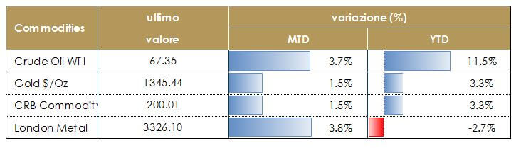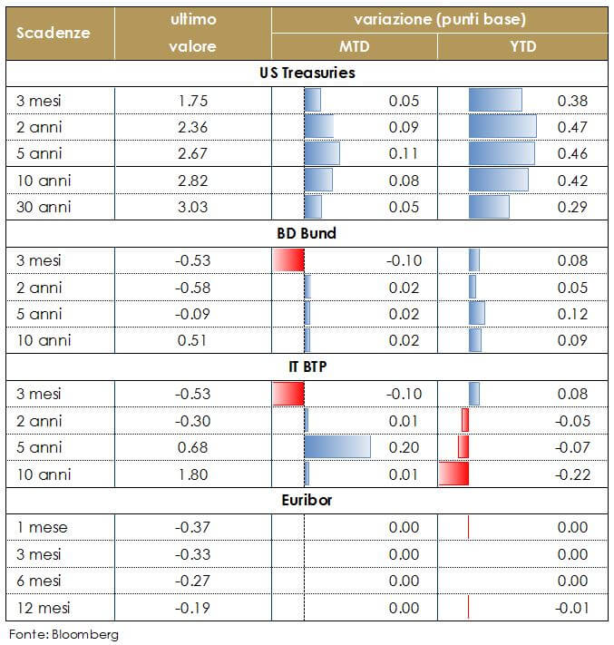 I verbali della Fed, rilasciati in settimana, hanno ribadito che i membri del FOMC hanno aumentato la fiducia sulle prospettive positive per l’economia statunitense. Il membri del FOMC concordano sul fatto che lo stimolo fiscale aumenterà la crescita, sebbene i tempi dell’effetto siano incerti. I verbali sono sostanzialmente coerenti con la previsione che il FOMC possa passare a una prospettiva di quattro rialzi quest’anno in giugno, se l’economia si evolverà come previsto. L’inflazione, misurata sull’indice CPI, a marzo è salita in linea con le attese, dal precedente 2.2% a 2,4% a/a, su base mensile l’indice ha corretto lievemente, registrando una variazione di -0,1% m/m contro aspettative di un indice invariato dopo il +0,2% m/m, osservato a febbraio. Il dato core dell’inflazione conferma le aspettative degli operatori, che crescono di 3 decimi e si assestano a 2,1% dal precedente 1,8%, superando la soglia del 2% per la prima volta da febbraio 2017. Anche il dato core risente comunque positivamente dell’effetto base di marzo: la variazione del CPI core rimane stabile a 0,2% m/m. L’indice relativo all’inflazione alla produzione si è attestato al disopra delle attese a 0,3% m/m (3,0% a/a) sopra le stime di 0,1% (2,9% a / a), e da febbraio a + 0,2% (+ 2,8% a/a). L’indice relativo all’inflazione alla produzione core PPI si è attestato a 0,3% m/m (consenso: 0,2% m/m), corrispondente a un 2,7% a/a (consenso: 2,6% a/a valore di febbraio 2,5% a/a).