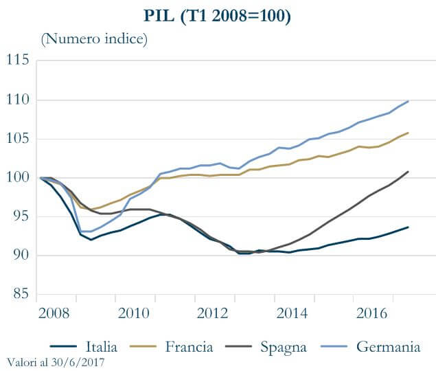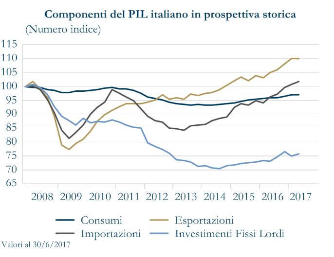 La ripresa dell’economia italiana procede con passo regolare in un quadro di più rapida crescita europea. In T2 il PIL è aumentato dello 0.4% t/t, oltre le attese, comportando un’accelerazione dell’incremento tendenziale dall’1.2% a/a all’1.5% a/a, mentre l’Area Euro nel suo complesso è cresciuta dello 0,6 t/t (pari a 2,3% a/a). Tuttavia il valore del prodotto interno lordo resta ancora inferiore al livello del 2008, mentre il PIL dell’Area Euro è tornato già in T2 2015 ai livelli pre-crisi. Particolarmente penalizzati sono gli investimenti fissi lordi, che in prospettiva storica si mantengono ad un livello nettamente inferiore al livello pre-crisi. Nella prima parte del 2017, invece, la crescita dell’economia è stata guidata dagli investimenti e dalle esportazioni in un contesto di continuo e graduale miglioramento del mercato del lavoro. Gli investimenti si sono avvantaggiati di condizioni finanziarie favorevoli e della riduzione dei margini di risorse inutilizzate, ma hanno anche messo a frutto le agevolazioni fiscali provenienti dal piano “Industria 4.0”. La componente relativa ai mezzi di trasporto si è confermata come la componente più dinamica e presenta in questa fase una crescita superiore a quella degli altri maggiori paesi dell’Area. Sugli investimenti in costruzioni, invece, incidono in negativo i vari disincentivi fiscali e di tassazione, oltre al numero elevato di immobili invenduti o vuoti. Per questo, in T2 la ripresa degli investimenti in costruzioni, più graduale, ha invece subito una battuta d’arresto, con una diminuzione che ha interessato, pressoché in egual misura, sia il comparto residenziale (-0.5%) sia quello non residenziale (-0.4%). La crescita dei consumi, che ha mostrato una relativa tenuta nella prima parte del 2017, dopo il rallentamento registrato in T3 e T4 del 2016, in T2 ha leggermente moderato il passo. Nel caso dell’Italia, la forte accelerazione di domanda di lavoro, avvenuta alla fine del 2015 e nel 2016, è stata favorita dalla decontribuzione per i nuovi assunti a tempo indeterminato. Tuttavia, il fisiologico raffreddamento che ne è seguito è risultato inferiore alle attese, a testimonianza di come il rafforzamento della ripresa della domanda, interna ed estera, stia sostenendo l’occupazione al di là degli incentivi. In termini storici, la ripresa attuale si configura come la più lenta ma longeva mai sperimentata in Italia: in dieci trimestri il PIL è cresciuto di 2.9%, poco meno dello 0.3% per trimestre, ma allo stesso tempo le riprese del passato si sono concluse prima del decimo trimestre, mentre la ripresa di oggi è ancora in corso e continuerà nella seconda parte del 2017 e nel corso del 2018 come lasciano prevedere gli indicatori anticipatori. Infatti la fiducia delle imprese ha continuato a migliorare e contemporaneamente si è assistito ad un rimbalzo della fiducia dei consumatori. Per questo, ci aspettiamo un consolidamento della ripresa economica, aiutata da un ambiente esterno favorevole e sostenuta dagli investimenti, che dovrebbero avere più spazio in questa fase congiunturale. Questa tesi è supportata anche dalle ultime previsioni del FMI, che all’interno dell’ultimo rapporto semestrale World Economic Outlook ha rivisto al rialzo la stima sulla crescita italiana, portandola a 1.5% da 1.3% di luglio sul 2017 e 1.1% da 1% sul 2018.