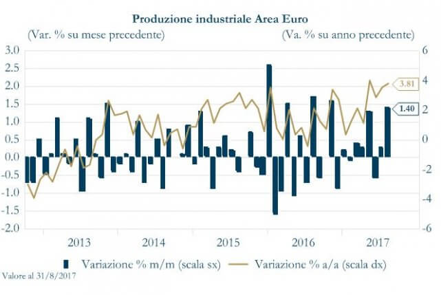 In agosto la produzioni industriale dell’Area Euro ha sorpreso al rialzo, registrando un aumento pari a 1.4% m/m, pari a 3.8% a/a. Le letture sono decisamente al di sopra delle attese degli economisti, che convergevano su un +0.6% a livello congiunturale e su un +2.6% tendenziale. Da segnalare anche la revisione al rialzo per il dato di luglio, allo 0.3% dallo 0.1% m/me e al 3.6% a/a dal 3.2% precedentemente indicato. In Germania la produzione è invece salita del 2.6% ad agosto, nettamente  sopra   le   attese, che  prevedevano  una crescita dello 0.9% su base mensile. Sull’anno, il rialzo è stato del 4.7%, anche qui ampiamente al di sopra del +2.9% atteso dagli analisti. La crescita della produzione industriale ad agosto in Italia è stata dell’1.2% rispetto a luglio e del 5.7% a/a.