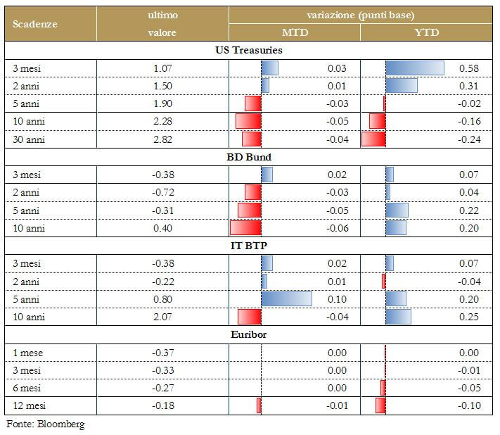 Le struttura a termine statunitense ha subito un modesto appiattimento, risentendo delle preoccupazioni di diversi esponenti Fed verso la debolezza dell’inflazione, emerse dai verbali dell’ultima riunione, preoccupazione che ha poi trovato risconto nella pubblicazione dell’indice CPI relativo al mese di settembre. La spinta inflattiva sembra derivare solamente dal prezzo della benzina, mentre la componente core resta silente. Sulla scia della correlazione con i rendimenti governativi statunitensi è sceso anche il decennale tedesco, tonando a 0.4%: l’attenzione dei mercati resta rivolta all’attesa dell’annuncio della rimodulazione della politica monetaria nel prossimo meeting della BCE. Bloomberg ha diffuso il rumors che l’autorità di politica monetaria sta valutando di ridurre della metà il rimo degli acquisti e proseguire per almeno nove mesi il programma nel 2018, lasciando aperta la data di chiusura del programma. Lo spread tra il Bonos e il Bund con scadenza dieci anni è rimasto sotto 120 pb, nonostante le tensioni in Catalogna.