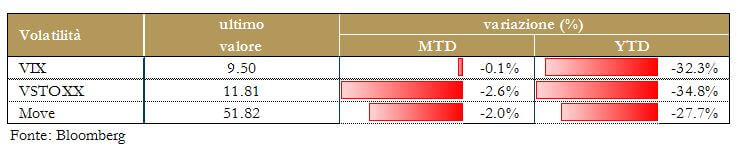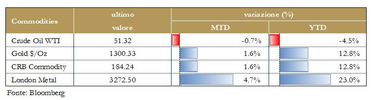 Continuiamo a vedere il prezzo del petrolio in un range ristretto rispetto all’ultimo decennio.Restiamo, altresi, positivi sull’oro: nel breve termine la dinamica del prezzo dell’oro è strettamente correlata con quella dei tassi di interesse reali. L’incertezza politica internazionale resta elevata e si configura come un importate driver positivo per l’allocazione in oro.