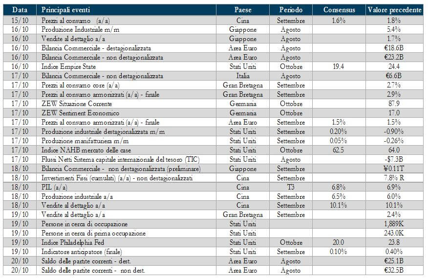 • Asia: in Cina verranno pubblicate l’inflazione di settembre, la produzione industriale e PIL del terzo trimestre. In Giappone sarà pubblicata la produzioine industriale e la bilancia commerciale.