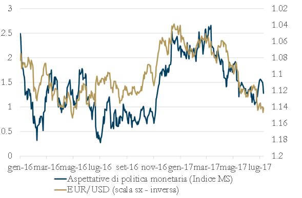 I mercati non condividono l’idea che l’accelerazione dell’inflazione sia ad oggi un rischio rilevante. Le aspettative di inflazione estratte dai TIPS a 10 anni sono tornate a 1.7%, mentre la probabilità prezzata sul mercato che il corridoio obiettivo per il fed fund rate resti fermo a settembre è pari all’80% e quella di un rialzo a dicembre è pari al 42%. La rimodulazione delle aspettative delle aspettative di politica monetaria si aggiunge all’incertezza connessa alla politica fiscale dell’amministratore Trump: il processo delle riforme è rimasto praticamente bloccato, mettendo in forte dubbio la capacità nell’Amministrazione di far approvare significativi cambiamenti della legislazione attuale e di conseguenza la capacità di far crescere gli investimenti e con essi la crescita potenziale del paese.