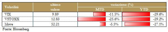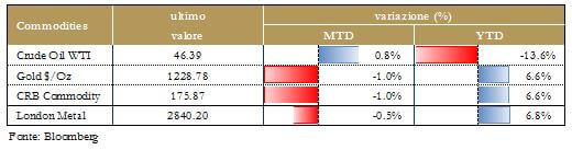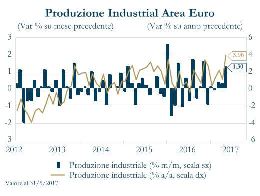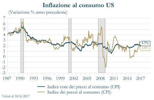 prezzi degli alimentari invece hanno apportato una variazione positiva, in recupero rispetto alla contrazione del mese precedente. Indicazioni positive anche dal Beige Book, che indica che l’attività economica ha continuato a crescere in tutti i distretti nel mese di giugno, anche se il ritmo della crescita varia da lieve a moderata. Le prospettive economiche restano positive in tutti i distretti. Le indicazione provenienti dall’inflazione al consumo misurata sull’indice CPI restano di una dinamica molto modesta: l’indice headline è rimasto invariato rispetto al mese precedente, riportando una variazione pari a 1.6% a/a, mentre la variazione dell’indice core, al netto della componente energetica ed alimentare, è rimasto a 1.7% a/a. Deboli anche i dati sulle vendite al dettaglio, che registrano a giugno un calo pari a 0.2% m/m. La fiducia dei consumatori misurata dall’indice Michigan è inoltre tornata al livello di novembre 2016 (93.1): il consumatore americano non crede all’aumento della crescita potenziale promessa da Trump in campagna elettorale.
