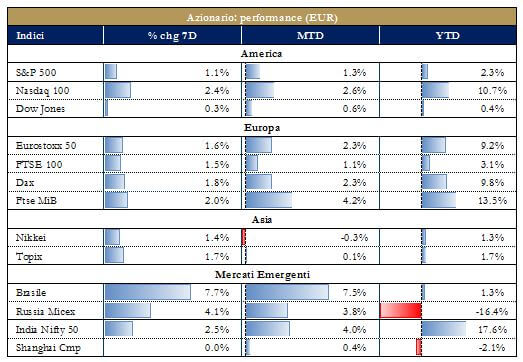 EUROPA Finanziari: Buoni i dati sulla raccolta degli Asset Gatheres, con Azimut che nel mese di giugno riceve €557mln e nel primo semestre €3.4mld. Banca Mediolanum ha raccolto a giugno €308mln, da inizio anno €2.3mld. Anima, nello stesso mese, ha registrato una raccolta netta positiva per €290mln. Banca Generali ha alzato le stime sulla raccolta di quest’anno, portandole a €5-5.5mld rispetto al precedente range di €4-4.5mld. Ha inoltre archiviato il mese di giugno con una raccolta netta di €620mln. Passando a Carige, la banca pensa di concludere entro luglio la cessione della tranche assistita da GACS della cartolarizzazione del portafoglio di NPL da €938mln ceduto al veicolo Brisca il 6 luglio. Il CdA ha avviato il processo di identificazione di un secondo portafoglio di sofferenze per circa €1.2mld da deconsolidare entro l’anno. Il CdA ha inoltre deliberato la fusione per incorporazione di Banca Cesare Ponti. Per quanto riguarda Creval, la banca ha annunciato di aver ceduto, tramite cartolarizzazione e garanzia GACS sulle tranche senior, un portafoglio di crediti in sofferenza per un gross book value pari a €1.4mld. Incorporando l’operazione, il NPL ratio lordo stimato al 30 giugno è al 21.2%, mentre il CET1 ratio è stimato a circa l’11%, anche a seguito dell’impatto negativo di circa 120bps determinato dall’operazione. In tema di Banche venete, l’Antitrust ha dato il via libera all’acquisizione di Popolare di Vicenza e Veneto Banca da parte di Intesa Sanpaolo e il Consiglio dei Ministri ha autorizzato il voto di fiducia sul decreto per la liquidazione ordinata delle due banche venete; con 318 voti favorevoli e 178 contrari, la camera ha votato la fiducia al governo sul decreto legge che disciplina la liquidazione ordinata di Veneto banca e Popolare di Vicenza. Banco Santander ha comunicato di avere avviato un’iniziativa commerciale riguardante l’offerta di perpetual bond per compensare alcuni clienti retail che hanno sottoscritto azioni e bond subordinati di Banco Popular e sono stati penalizzati dalla risoluzione della banca. Infine, Royal Bank of Scotland ha raggiunto un accordo con le autorità USA per le violazioni delle leggi federali connesse ai residential mortgage-backed security: RBS pagherà infatti $5.5mld per il ruolo che ha avuto nella vendita di prodotti a rischio. Energy: EDF, secondo alcune fonti, non rientra nei piani del governo francese riguardante la vendita di partecipazioni statali del valore di €10mld per finanziare progetti destinati all’innovazione. Eni US sarà la prima società dal 2015 a cui sarà permesso di condurre esplorazioni nelle acque federali dell’Alaska dopo che l’amministrazione Trump ha approvato un piano di perforazioni, sbloccando contratti che erano fermi da dieci anni. Secondo Il Sole 24 Ore, A2A ha ricevuto due offerte non vincolanti per il 41.7% di EPCG, da ContourGlobal e Fortum. Falck Renewables ha raggiunto un accordo con Svelgen Kraft Holding per l’acquisto dell’80% in Vestavind Kraft, che detiene due progetti eolici approvati in Norvegia per una capacità complessiva di circa 70 MW. Total ha comunicato che è intenzionato a investire $3.5mld durante i prossimi 5 anni nel campo petrolifero offshore Al Shaheen, in Qatar, e che si aspetta di produrre 300,000 barili al giorno nel prossimo futuro. Enertronica ha deliberato i termini e le condizioni di un prestito obbligazionario convertibile per un importo massimo di €16mln e scadenza a fine 2022, che sarà quotato sull’AIM. Inoltre, ha sottoscritto un accordo con Fineldo per l’acquisizione del 100% di Progetti International. L’intesa prevede che Fineldo sottoscriva un aumento di capitale riservato per €1mln e una tranche del bond convertibile per €1.5mln. A seguito di questi risultati, aumenta a 1 miliardo di barili di olio equivalente le risorse in posto di Amoca, spianando così la strada alla realizzazione di un piano di sviluppo accelerato. Infine, ERG ha collocato un bond da €100mln non convertibile, di tipo unsecured, con scadenza 2023, riservato a investitori istituzionali. Telco: i vertici de Il Sole 24 Ore e i sindacati hanno raggiunto un accordo che prevede 236 esuberi fra grafici e poligrafici. Inoltre Urbano Cairo, presidente e AD del gruppo RCS, conferma la guidance di utile netto per quest’anno, pari a €45mln. Costruzioni: la controllata di Salini Lane Construction si aggiudica un contratto da $232mln negli USA per la sostituzione dell’Unionport Bridge nel Bronx County. L’opera verrà realizzata da Lane in joint venture con Schiavone Construction Company. Food: Third Point, che a giugno ha rivelato una partecipazione da $3.5mld in Nestlé, sta continuando a fare pressioni sulla società sollecitandola a sforzarsi per incrementare i profitti; lo scorso mese Nestlè, per andare incontro alle richieste del fondo, ha annunciato un programma di buyback da $21mld, ma per ora non ha acconsentito alla vendita della partecipazione in L’Oreal come vorrebbe il fondo. M&A: Il Sole 24 Ore scrive che Banco BPM nelle prossime settimane conferirà Aletti Gestielle ad Anima per oltre €500mln, primo passo nella creazione di un polo del risparmio gestito che prevederà, come tappe successive, il conferimento in Anima di BancoPosta Fondi di Poste Italiane e la cessione di una quota della nuova società a CDP.