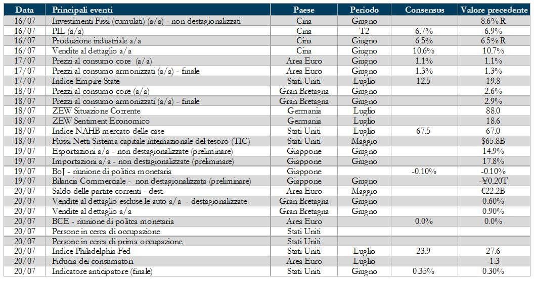 - Asia: in Cina deciso focus sull’andamento dell’economia reale con l’uscita del GDP, della produzione industriale e delle vendite al dettaglio. Anche in Giappone interesse per l’economia reale (All Industrial Activity Index e Machine Tool Orders) e per la bilancia commerciale. Infine in Australia attenzione al mercato del lavoro.