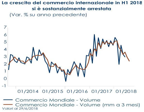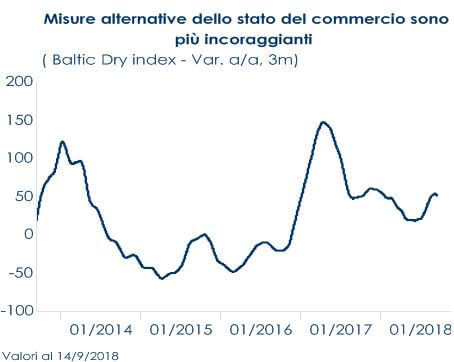 L’innovazione tecnologica e finanziaria ha radicalmente ridisegnato il paradigma tradizionale della produzione industriale, rendendo il settore manifatturiero integrato a livello internazionale e il valore aggiunto nella produzione manifatturiera non più direttamente associabile ad un unico paese: sistemi produttivi localmente segmentati sono stati sostituiti da catene globali del valore, in cui le singole fasi della filiera di produzione sono parcellizzate e svolte da fornitori e reti di imprese sparse in diversi paesi, sulla base della convenienza economica, del grado di competenza e della specializzazione delle aziende coinvolte. Secondo quanto recentemente pubblicato dalla Bank of International Settlement, oggi il commercio globale di beni e servizi intermedi è quasi il doppio di quello del commercio di beni e servizi finali. La presenza di catene integrate di valore ha fatto aumentare la correlazione tra la dinamica del commercio internazionale sia con la produzione manifatturiera che con la fiducia delle imprese manifatturiere. Nella prima metà del 2018, la crescita del commercio internazionale si è sostanzialmente arrestata dal picco degli ultimi sette anni registrato nel 2017 (Fig. 1), mentre le importazioni mondiali di beni si sono contratte in T2, invertendo il processo di crescita registrato in T1, a fronte anche di un aumento delle politiche protezionistiche e delle tensioni commerciali tra US e Cina. Il calo delle esportazioni rispetto a inizio anno è stato particolarmente marcato in US e Cina. Gli ordini all’esportazione della Cina sono diminuiti per il quinto mese consecutivo, sebbene in misura leggermente inferiore a luglio, mentre gli ordini all’esportazione statunitensi sono rimasti sostanzialmente stagnanti dopo due mesi di calo marginale. Contestualmente, si è verificato un graduale rallentamento degli indici PMI manifatturieri da dicembre 2017 (Fig.2), guidato da un calo a un minimo di due anni dei nuovi ordini, che a sua volta riflette una stagnazione dei nuovi ordini all’esportazione (Fig.3). Le imprese, intervistate nei sondaggi, indicano i dazi e le guerre commerciali come fattori chiave responsabili del peggioramento della produzione, delle attese delle imprese e dei flussi delle esportazioni. Guardando alla scomposizione per paesi, gli indici PMI per singolo paese segnalano un rallentamento della crescita economica tra T2 e T3 in tutte le principali economie mondiali, con l’eccezione dell’India. Al riguardo, ci attendiamo che questo rallentamento si traduca in tassi di crescita deboli della produzione manifatturiera globale nella seconda parte dell’anno. Misure alternative dello stato del commercio mondiale sono più incoraggianti per i prossimi mesi e indicano che ci dovrebbe esserci una ripresa nella seconda parte dell’anno, a condizione che la “guerra commerciale” globale non si intensifichi drasticamente (Fig.4). L’indice Baltic Dry, un buon indicatore della domanda di spedizione, che tiene traccia dei costi di spedizione per mare di merci sfuse, mostra che una ripresa in atto nell’ultimo mese. Questo potrebbe lasciar prevedere un futuro miglioramento qualora le tensioni protezionistiche non dovessero intensificarsi.