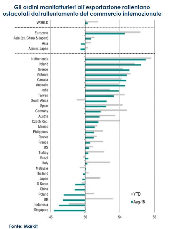 Gli ordini manifatturieri all’esportazione rallentano ostacolati dal rallentamento del commercio internazionale