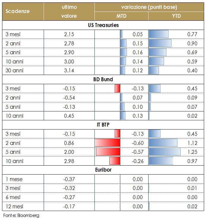 I rendimenti dei decennale US si avvicinano al 3,0%, quelli dei Bund sono superiori a 40pb, influenzati dai buoni dati macroeconomici statunitensi delle ultime settimane (ISM e salari), mentre i Gilt risentono dei timori di “no-deal Brexit”. Questa settimana è stata ricca di appuntamenti delle banche centrali nelle economie avanzate e nei paesi emergenti. La Banca Centrale Turca, per riacquistare credibilità e dimostrare la sua indipendenza, ha aumentato il tasso repo di una settimana di 625 pb al 24% dal 17,75%, al disopra delle attese di mercato, e si è impegnata a mantenere condizioni restrittive fino a quando l’andamento dell’inflazione non ricomincerà a mostrare progressi significativi. Anche la Banca Centrale Russa ha sorpreso con un rialzo di 25 pb, il primo dal 2014. La banca centrale argentina ha lasciato i tassi di interesse invariati al 60% confermando il suo impegno a non abbassare i tassi di interesse fino a dicembre per stabilizzare il peso. Anche la BoE ha lasciato invariato il tasso di riferimento allo 0,75%, e lo stock di acquisti di obbligazioni societarie (10 miliardi) e di titoli di stato (435 miliardi di sterline) con una decisione presa all’unanimità. La BoE resta estremamente cauta nel procedere verso una nuova stretta monetaria, a causa della lentezza con cui procedono le trattative della Brexit e per questo i tassi resteranno fermi per il resto dell’anno. Poche novità sono arrivate anche dalla riunione della BCE, cha ha lasciato invariati i propri parametri di politica monetaria. La politica monetaria rimane ampiamente accomodante, con il mercato che prezza un primo rialzo dei tassi (10 pb) ad ottobre 2019. Il Presidente Draghi ha descritto l’espansione economica come continua e ampia, indicando che gli ultimi dati restano coerenti con lo scenario alla base delle decisioni di politica monetaria prese. Le proiezioni macroeconomiche aggiornate hanno visto una marginale revisione al ribasso della crescita nel 2018-19, ma un profilo invariato per l’inflazione primaria. La BCE ha rivisto marginalmente al ribasso le proprie stime di crescita per il 2018 e 2019 (rispettivamente 2.0 da 2.1 e 1.8 da 1.9), a causa di un indebolimento della domanda globale. I rischi sono ancora valutati come “bilanciati” anche se è aumentato il rischio di una deriva protezionistica e le pressioni sui paesi emergenti. Draghi si è espresso anche sull’Italia. Non vedendo al momento un rischio di contagio ad altri paesi periferici, ha invitato i mercati a guardare ai fatti (DEF e discussioni parlamentari) e non alle parole dei politici.