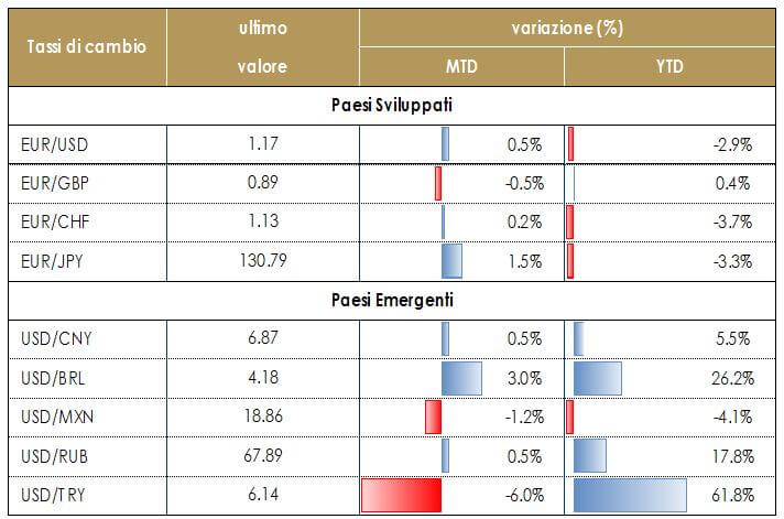 L’euro si è apprezzato moderatamente nei confronti del dollaro, sulla scia del dato sull’inflazione statunitense sotto le attese e della conferenza stampa della BCE, che ha confermato i parametri di politica monetaria e la fiducia del Consiglio Direttivo sul fatto che l’inflazione dell’Area Euro sta tornano gradualmente al 2%. Il dollaro statunitense nei confronti dello yen si è avvantaggiato della maggior propensione al rischio prevalente sui mercati dopo la riapertura del dialogo fra Stati Uniti e Cina. La lira turca si è apprezzata sia contro euro che contro dollaro, dopo il rialzo dei tassi più alto delle attese e ha trascinato al rialzo tutto il comparto degli emergenti.