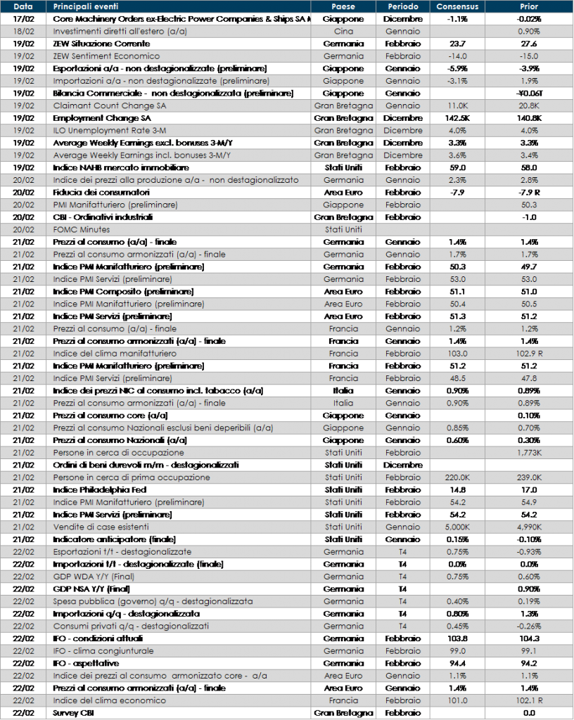 Europa: saranno pubblicati i valori preliminari degli indici Markit per il mese di febbraio. In Germania saranno pubblicati gli indici ZEW e IFO sulla fiducia delle imprese e in Francia l’INSEEE. Saranno, inoltre, pubblicati i verbali della riunione BCE dello scorso 24 gennaio