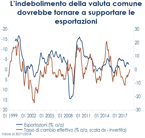 | Il rallentamento della crescita dell’Area Euro è continuato per l’effetto combinato sia una crescita globale più debole che di condizioni finanziarie più rigide, nonché per la presenza di alcune distorsioni idiosincratiche, attestandosi a 0.2% t/t in T4 2018. Anche i dati sulla produzione industriale, rilasciati questa settimana, hanno confermato l’ampio rallentamento registrato alla fine del 2018. La produzione industriale è scesa a dicembre di 0.9% m/m (dopo l’1,7% m/m di novembre), registrando, così, un calo del 4.2% a/a, il minimo da fine 2009. Il calo di dicembre non è imputabile esclusivamente ai problemi nell’industria automobilistica, in quanto la produzione di veicoli è aumentata dell’8,2%, favorita dall’aumento del 9,9% della produzione automobilistica tedesca. Il rallentamento all’interno dell’Area è stato disomogeneo in termini di intensità e di cause specifiche (Fig:1): l’Italia è entrata in una (mini) recessione tecnica, guidata dall’aumento del rischio paese (legato alla vicenda della Legge di Bilancio 2019), che ha impattato gli indici di fiducia, in particolare quello delle imprese, e le condizioni finanziarie, mentre la Germania è scivolata in una fase di stagnazione, con un’economia cresciuta appena dello 0,02% in T4 2018, dopo essersi contratta dello 0,2% in T3. Sull’economia tedesca hanno pesato sia la debolezza del commercio internazionale sia le persistenti incertezze legate a fattori geopolitici e alla minaccia del protezionismo. La Francia ha registrato un peggioramento marcato della propria congiuntura in dicembre, legato alla protesta dei gilet gialli, che ha depresso la produzione in numerosi settori dopo un T3 in cui l’economia francese aveva fatto meglio della media dei paesi dell’Area Euro. Viceversa, l’economia spagnola resta sufficientemente vivace, crescendo a 2.3% a/a, ma ha risentito del calo della produzione industriale tedesca, a causa della forte integrazione tra le catene produttive dei due paesi. In un orizzonte di medio termine, le survey e gli indicatori anticipatori non mostrano segnali di miglioramento, mentre l’ESI ha raggiunto a gennaio il suo minimo a 26 mesi e l’indice PMI è al livello più basso da luglio 2013. I nostri indicatori anticipatori proprietari segnalano che i principali paesi dell’Area sono in una fase di rallentamento (Fig:2).Rischi al rialzo per questo scenario provengono:1. dai consumi privati, che dovrebbero riacquistare slancio nei prossimi mesi, sostenuti dall’andamento favorevole del mercato del lavoro (Fig:3), dove il miglioramento dell’occupazione continua a sostenere il reddito delle famiglie, che dovrebbe, inoltre, essere sostenuto nei prossimi mesi dal calo dei prezzi del petrolio avvenuto dopo metà novembre;2. dal recente deprezzamento dell’euro, che dovrebbe sostenere una ripresa delle esportazioni (Fig:4);3. da politiche fiscali più espansive nei principali paesi dell’Area.Rischi al ribasso per questo scenario provengono, invece, dalle tensioni commerciali. Una eventuale imposizione di dazi sul settore automobilistico da parte dell’amministrazione US rappresenta la principale minaccia. A tale riguardo, il rapporto del Dipartimento del Commercio US riguardante il potenziale impatto sulla sicurezza nazionale delle importazioni del settore auto (sia autoveicoli sia parti) è previsto per il 17 febbraio. Tale report potrebbe, da un lato, divenire un catalizzatore per una decisione del presidente Trump su questo tema, dall’altro, indicare quali paesi, dopo la Cina, saranno oggetto dell’attenzione USA in tema di commercio internazionale, mantenendo aperti i rischi di una possibile escalation sui dazi. Una eventuale imposizione di dazi sul settore automobilistico implicherebbe che le tensioni commerciali, concentratesi finora principalmente sulla Cina, potrebbero diventare globali (ed economicamente più significative). | PIL Paesi Area Euro