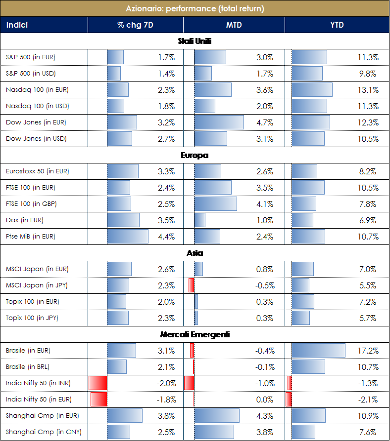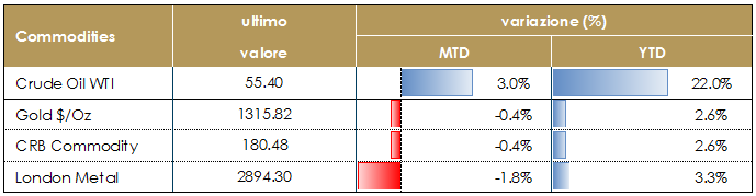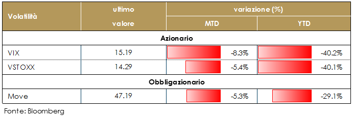 Il presente documento (il “Documento”) è stato preparato dalla Funzione Asset Allocation di Mediobanca SGR SpA (la “SGR”) a scopo puramente informativo. Il documento non ha carattere di offerta, invito ad offrire, o di messaggio promozionale finalizzato all’acquisto, alla vendita o alla sottoscrizione di strumenti/prodotti finanziari di qualsiasi genere. Inoltre, esso non è inteso a raccomandare o a proporre una strategia di investimento in merito a strumenti finanziari. In particolare il presente Documento non costituisce in alcun modo una raccomandazione personalizzata; lo stesso è stato predisposto senza considerare gli obiettivi di investimento, la situazione finanziaria o le competenze di specifici investitori. Il presente Documento è proprietà di Mediobanca SGR; esso non può essere riprodotto o pubblicato, nemmeno in una sua parte, senza la preventiva autorizzazione scritta della SGR. Le informazioni, opinioni, valutazioni e/o previsioni contenute nel presente Documento (le “Informazioni”) si basano su fonti ritenute autorevoli ed attendibili; tuttavia, la SGR non assume alcuna responsabilità per eventuali errori od omissioni né potrà considerarsi responsabile per le eventuali perdite, danni o conseguenze di qualsivoglia natura (legali, finanziarie o fiscali) che dovessero derivare dal fatto che si sia fatto affidamento su tale Documento. Ciascun investitore dovrà pertanto assumere le proprie decisioni di investimento in modo autonomo, tenuto conto delle sue caratteristiche e dei suoi obiettivi di investimento, e a tale scopo non dovrà basarsi, prioritariamente o esclusivamente, sul presente Documento. I rendimenti passati, eventualmente rappresentati nel Documento, non sono indicativi né garantiscono gli stessi rendimenti per il futuro. Le Informazioni contenute nel presente Documento costituiscono valutazioni aggiornate alla data della sua produzione e potrebbero variare nel tempo, senza necessità di comunicazione da parte della SGR.