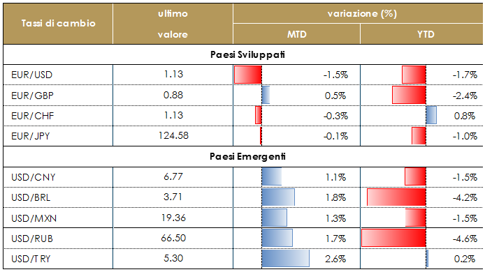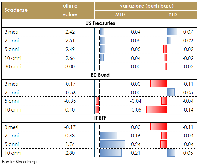 Il CPI a gennaio è rimasto invariato su base mensile (1,6% a/a): la variazione negativa subita dalla componente relativa all’energia (-3,1% m/m) ha compensato i rialzi delle altre voci. L’indice core è aumentato di 0,2% m/m (2,2% a/a), per il quarto mese consecutivo. La componente relativa ai beni core ha visto aumentare i prezzi dello 0,4% m/m, spinta dalle auto (nuove +0,2% m/m, usate +0,1% m/m), abbigliamento (+1,1% m/m, dopo due mesi deboli), prodotti sanitari (+0,1% m/m). Anche i prezzi dei servizi ex-energia sono aumentati dello 0,2% m/m, con aumenti di 0,3% m/m per abitazione e sanità e correzioni per le tariffe aeree e per i premi assicurativi del settore auto. I dati continuano a mostrare assenza di pressioni inflazionistiche. Il PPI a gennaio è calato di -0,1% m/m, ma l’indice core aumenta di 0,3% m/m. Le indicazioni che si possono ricavare da questa pubblicazione restano in linea con un andamento molto moderato dell’inflazione. L’indice PPI headline in calo dello 0,1% m/m a gennaio rispetto al consenso per un incremento dello 0,1%. L’indice core è risultato in aumento dello 0,3% rispetto al consenso per un incremento dello 0,2%. Le vendite al dettaglio di dicembre hanno sorpreso marcatamente verso il basso, segnando una variazione di -1,2% m/m per l’aggregato totale, di -1,8% m/m per quello ex-auto e di -1,4% m/m per quello al netto di auto e benzina, registrando il calo più marcato dal 2009. La sorpresa negativa arriva dopo molti mesi di crescita solida e potrebbe essere stata anche influenzata dallo shutdown, in atto negli ultimi 10 giorni del mese, oltre che dalla correzione dei mercati, particolarmente marcata nella seconda metà del mese. Bisognerà attendere la fine degli effetti dello shutdown e la normalizzazione del flusso dati per avere una valutazione più attendibile. L’indice di fiducia NFIB delle piccole imprese è sceso di 3,2 punti a gennaio a 101,2 (consenso di 103,0), segnando il valore minimo dall’autunno 2016 e risentendo dell’incertezza inerente allo shutdown e all’instabilità del mercato finanziario. Contestualmente, l’indice di incertezza della NFIB ha raggiunto la quinta valore più alto nei 45 anni di storia dell’indagine. La scorsa settimana, WSJ aveva dichiarato che molte piccole imprese stanno diventando più caute riguardo ai loro piani di investimento e assunzioni.