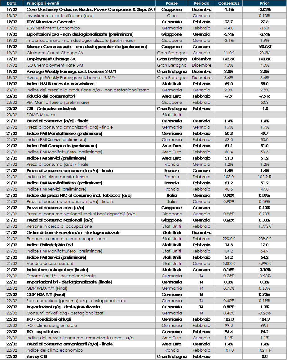 Europa: saranno pubblicati i valori preliminari degli indici Markit per il mese di febbraio. In Germania saranno pubblicati gli indici ZEW e IFO sulla fiducia delle imprese e in Francia l’INSEEE. Saranno, inoltre, pubblicati i verbali della riunione BCE dello scorso 24 gennaio