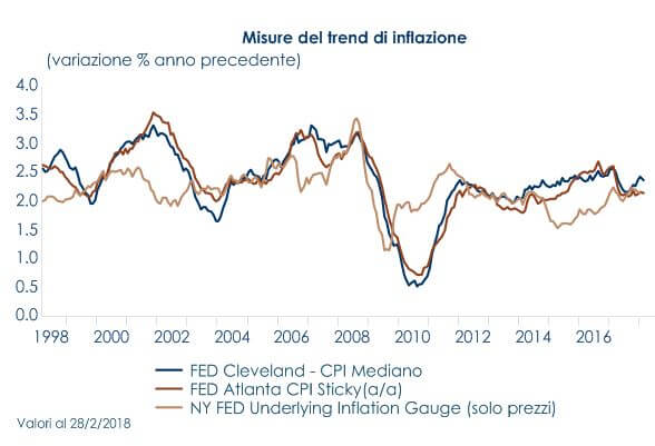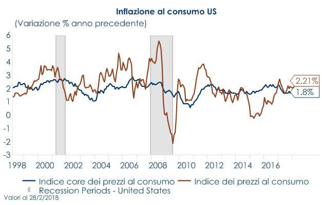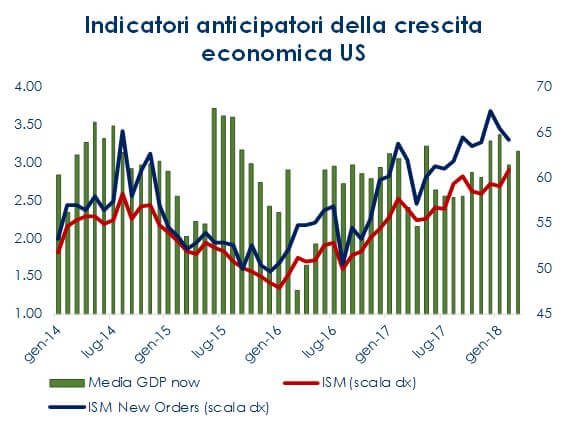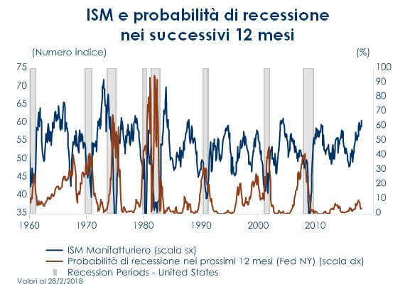 L’economia statunitense è solida, la crescita nel 2017 è stata pari al 2,5% a/a, stabilmente al di sopra del tasso di crescita potenziale (1,75% a/a) ed è destinata a crescere ad un ritmo moderato nei prossimi mesi, grazie a condizioni finanziarie espansive, alla spinta derivante dalla nuova riforma tributaria e ad una crescita globale migliore del previsto. In questo contesto, si notano alcuni segnali di maturità del ciclo economico e un contestuale aumento del rischio di rallentamento dello stesso, che si manifesta con una moderazione del momentum della crescita economica e una fisiologica flessione degli indicatori anticipatori. Il primo segnale proviene dall’indice di sorpresa economica, che pur restando ampiamente in territorio positivo, ha subito un rallentamento dai massimi di inizio anno. Un secondo segnale giunge dalla moderazione dei consumi: nell’ultima settimana, la Fed di Atlanta ha abbassato la sua previsione di crescita del PIL per T1 2018 all’1,9%, dal 2,5% del 9 marzo e dal 5% di inizio febbraio a seguito di un altro rapporto sulle vendite al dettaglio più debole del previsto. Le vendite al dettaglio a febbraio, sono diminuite dello 0,1% m/m, posizionandosi al di sotto delle stime di consenso (0,3% m/m). La componente control group retail sales, che rientra direttamente nella stima del PIL è aumentata dello 0,1% m/m, anch’essa al di sotto delle attese (+ 0,5%). Questo risultato deludente ha, quindi, indotto gli analisti a tagliare le proiezioni per il PIL del primo trimestre. Contestualmente, i mercati hanno rivisto al ribasso la probabilità di un secondo rialzo del costo del denaro da parte della Fed a giugno, che è scesa al 67% dal 71% del giorno precedente. Viceversa, resta solido e vivace il settore manifatturiero: l’indice anticipatore Current Activty indicator (CAI) di Goldman Sachs conferma la crescita diffusa a diversi sotto-settori dell’economia, mentre l’indice ISM manifatturiero a febbraio ha raggiunto 60.8, marcatamente al di sopra delle attese e riportando la lettura migliore dal 2004. Guardando alla scomposizione per componenti dell’indice ISM si osserva che la componente new orders ha già registrato il suo punto di svolta e a febbraio è scivolato a 64,2 da 65,4. Poiché, storicamente, l’indice ISM new orders anticipa i punti di svolta dell’indice ISM manifatturiero, ci aspettiamo una flessione di quest’ultimo nei prossimi mesi, comunque compatibile con una crescita dell’economia statunitense sopra il potenziale. Infatti in media, l’ISM manifatturiero ha superato 60 3,5 anni prima del verificarsi di una recessione e 2,5 anni prima che i mercati inizino a prezzare una probabilità di recessione (almeno pari al 30%) nei successivi 12 mesi. La probabilità di recessione riportata nel grafico sottostante è calcolata della Fed di New York e si basa sull’inclinazione della struttura a termine dei rendimenti governativi statunitensi, il cui potere predittivo risulta recentemente avvalorato: la scorsa settimana, la Fed di San Francisco ha ribadito che periodi caratterizzati da una curva dei rendimenti invertita sono seguiti mediamente da rallentamenti economici, e quasi sempre da una recessione, sottolineando che, anche se il contesto attuale appare unico rispetto alla recente storia economica, l’evidenza statistica suggerisce che il potere predittivo della curva invertita non è diminuito. Inoltre, le prime indicazioni degli indici di fiducia relativamente al mese di marzo, confermano ancora la percezione positiva dello scenario economico statunitense da parte delle imprese manifatturiere. Sul fronte delle imprese, l’indice Empire manifatturiero della Fed di New York a marzo sale oltre le attese a 22,5 punti (consenso: 15,0) dai 13,1 di febbraio. Invece, l’indice di fiducia delle imprese della Fed di Philadelphia scende a 22,3 punti (consenso: 23,0) dai 25,8 precedenti, ma la disaggregazione delle componenti offre comunque dei segnali positivi, con i nuovi ordini e gli ordini inevasi in netta crescita.