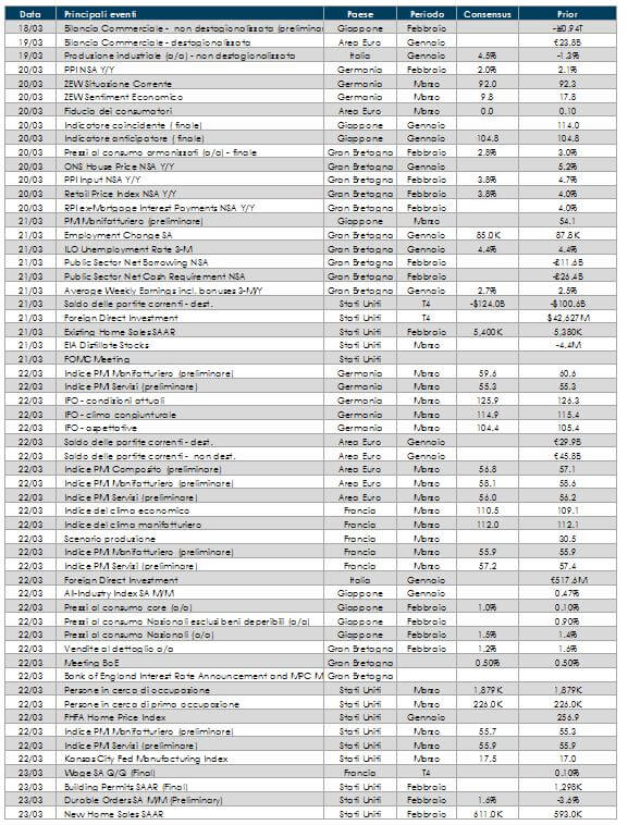- Stati Uniti: L’evento principale della settimana è la riunione di politca moentarai della Fed. Saranno disponibi le letture preliminari degli indici Markit per il mese corrente. Gli altri dati principali riguardano il settore immobiliare di febbraio, con vendite case nuove, case esistenti e prezzi case FHFA.