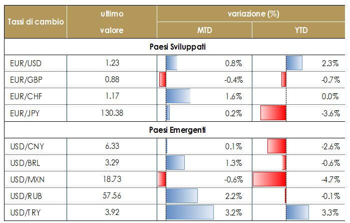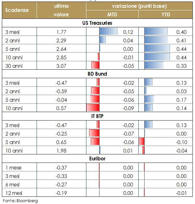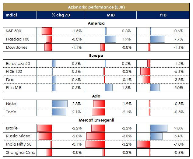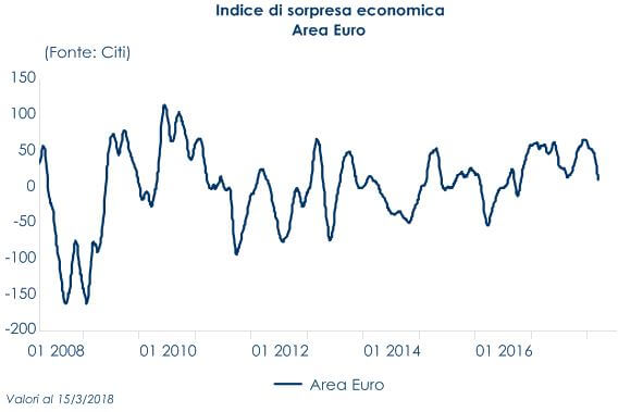 In settimana è stata pubblicata la stima finale dell’inflazione dell’Area per il mese di febbraio, che si è attestata all’1,1% a/a, rispetto alla lettura preliminare dell’1,2%.Mese su mese, inflazione è stata pari a 0,2% (consenso: 0,2% , valore precedente: 0,9%). Il dato potrebbe avere un impatto sulla tempistica di uscita della BCE dal piano di acquisto di attività. Come ricordato anche in settimana dal presidente Draghi, tre sono le condizioni legate all’inflazione affinché la BCE smetta di comprare attività: 1) convergenza verso il target, 2) fiducia nella convergenza nel medio periodo, 3) stabilità del processo di convergenza. In Italia, le vendite al dettaglio correggono per il secondo mese di fila, segnando a gennaio una variazione di -0,5% m/m a cui si somma la revisione al ribasso della stima del mese precedente a -0,9% m/m (-0,3% precedente). Il dato su base annua vede il calo delle vendite ampliarsi da -0,2% a -0,8% ed estendersi dai negozi di dimensione piccola anche a quelli di dimensioni maggiori.