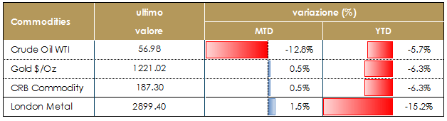 In calo marcato il prezzo del petrolio, sulla scia dei timori di mercato di un eccesso di offerta in un periodo di probabile rallentamento economico in una settimana in cui questi timori timori hanno trovato conferma mercoledì nei dati relativi al Giappone e alla Germania – che hanno registrato una contrazione del PIL rispettivamente del 1.2% a/a e dello 0.2% a/a- e nei continui segnali di rallentamento della Cina, che resta il primo importatore mondiale. Intanto, le scorte di greggio stanno aumentando. L’American Petroleum Institute in settimana ha comunicato che le scorte sono salite nella settimana fino al 9 novembre a quota 440,7 milioni con un incremento di +8,79 milioni, ben al di sopra delle attese di 3,2 milioni. |