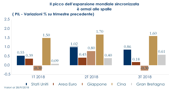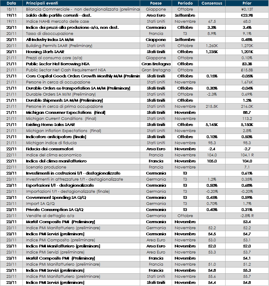 - Europa: l’attenzione sarà rivolata al PMI composito atteso e alla seconda stima del PIL tedesco relativo a T3. Inoltre saranno pubblicati i verbali dell’ultima riunione della BCE. Infine, la Commissione Europea emetterà il parere definitivo sui Budget 2019 dei paesi membri: Bruxelles dovrebbe confermare che la manovra italiana configura uno scostamento significativo dalle regole del Patto di Stabilità e Crescita.
