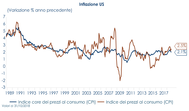 In ottobre l’indice headline dei prezzi al consumo CPI in ottobre è salito dello 0,3% m/m (consenso 0.3% m/m, valore del mese precedente 0,1%), riportando la variazione annuale a + 2,5% a/a da 2,3% a/a precedente. I prezzi della benzina sono responsabili di oltre un terzo dell’aumento complessivo di ottobre. Dallo spaccato delle componenti emerge un rimbalzo dei prezzi dei veicoli usati, dopo il calo significativo del mese precedente, a fronte di una diminuzione di quelli nuovi, mentre l’effetto dei dazi sui prodotti cinesi dovrebbe essere ancora compensato dal rafforzamento relativo del dollaro. E’ risultato in aumento anche l’indice core, al netto della componente energia e alimentari, è salito dello 0,2% m/m (consenso: 0.2% m/m, valore del mese precedente + 0,1% m/m). In rialzo del 2,1% a/a, sebbene i prezzi core siano aumentati solo dell’1,6% su base annua negli ultimi tre mesi. Le cure mediche e l’assicurazione auto sono aumentate mentre la comunicazione, i nuovi veicoli e i prezzi delle attività ricreative sono diminuiti. Le vendite al dettaglio di ottobre sono aumentate dello 0,8% m/m (consenso 0,6% m/m, valore precedente – 0,1% m/m in parte spinte dal rialzo del prezzo della benzina (che sappiamo essere temporaneo). Le vendite al dettaglio ex-auto sono aumentate dello 0,7% m/m (consenso + 0,5% m/m, mese precedente – 0,1% m/m). Nel complesso i dati sono positivi ma, se valutati in termini reali, segnalano rallentamento della dinamica della spesa verso un ritmo vicino al 2,5% t/t annualizzato, in T4, dopo due trimestri di crescita vicina al 4% t/t annualizzato. L’indice Empire della NY Fed si è attestato a 23.3 a novembre (consenso 19,0, mese precedente 21,1). I nuovi ordini sono calati a 20, dal 22,5 di ottobre, mentre le spedizioni sono aumentate moderatamente e gli ordini inevasi sono rimasti costanti. I prezzi pagati sono rimasti elevati mentre l’indice dei prezzi ricevuti è stato leggermente modificato. L’indice dei prezzi pagati è risultato in ulteriore rialzo, mentre quello dei prezzi ricevuti è rimasto positivo, vicino ai livelli di ottobre Al contrario, l’indice della Philadelphia Fed a novembre coregge a 12,9 da 22,2 di ottobre (consenso 20,6). Le principali componenti sono in flessione: ordini a 8,1 da 19,1, consegne a 21,6 da 24,6, occupati a 16,3 da 19,3, settimana lavorativa a 6,3 da 21,3. Gli indici di prezzo restano in territorio espansivo, ma su livelli più bassi rispetto a ottobre. La produzione industriale a ottobre dovrebbe aumentare di 0,1% m/m (consenso 0.2% m/m mese precedente +0,3% m/m), sulla scia della debolezza delle utility. Il manifatturiero dovrebbe essere in accelerazione, con una variazione di 0,3% m/m dopo +0,2% m/m, alla luce delle indicazioni degli occupati nel settore, pur in presenza di stabilità delle ore lavorate