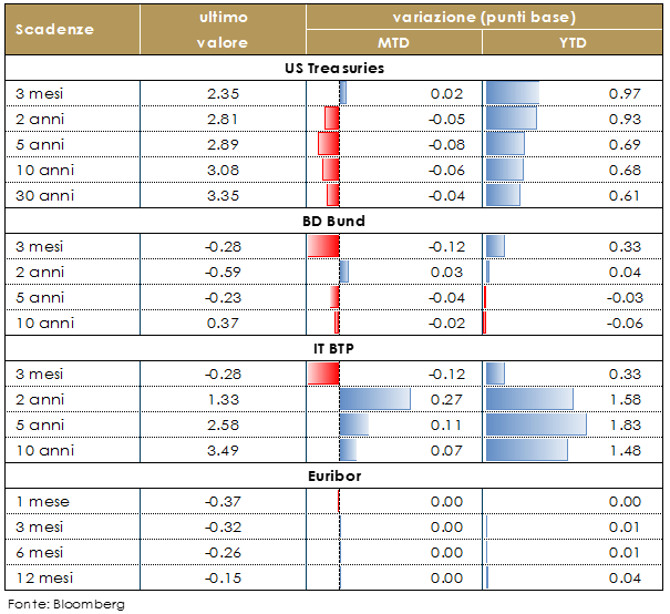 I titoli obbligazionari delle principali economie core hanno segnato moderati movimenti al ribasso in settimana.