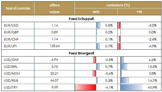 Riteniamo che le dinamiche commerciali e la rimodulazione delle attese future da parte della Fed guideranno il rafforzamento del dollaro fino alla fine dell’anno. La normalizzazione della politica monetaria si sta muovendo a ritmi diversi tra le banche centrali e i mercati hanno rimodulato le aspettative di politica monetaria. La Fed procede il suo percorso di rialzo del costo del denaro muovendosi verso la neutralità, mentre la BCE manterrà i tassi invariati fino all’estate 2019, terminando gli acquisti netti da dicembre dell’anno in corso e la Banca del Giappone ha lasciato la sua politica invariata ma ha rivisto al ribasso le stime sull’inflazione. Si è, dunque, ampliata la divergenza delle politiche monetarie. |